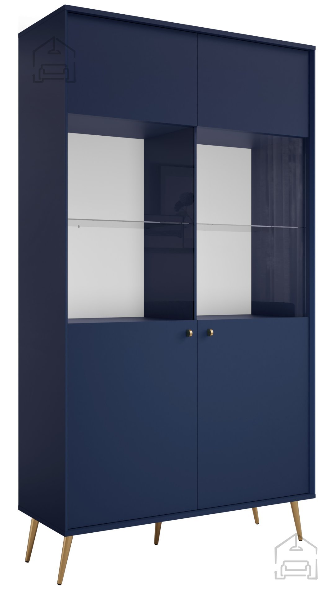 Die Vitrine lässt sich hervorragend mit anderen Möbelstücken kombinieren und ermöglicht es, ein harmonisches Ganzes im Wohnzimmer, Esszimmer oder sogar im Büro zu schaffen. Aufgrund der universellen Farbkombination von Blau und Gold passt sie sowohl in helle als auch in dunklere Interieurs.