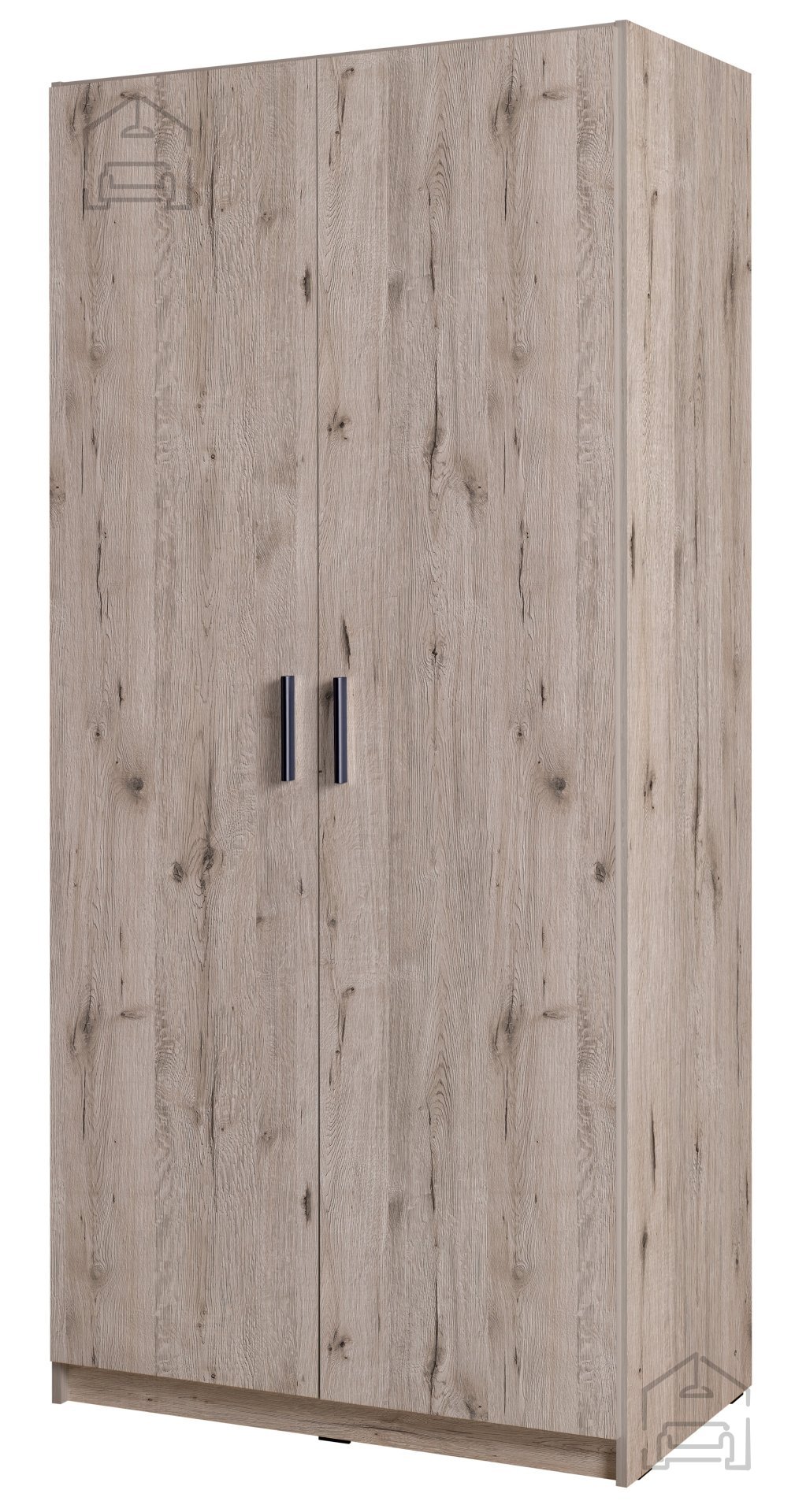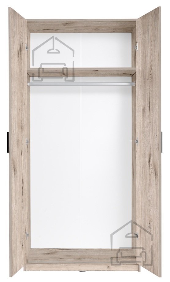 Dieser zweitürige Kleiderschrank besteht aus einer hochwertigen laminierten Platte mit einer Stärke von 16 mm, was Haltbarkeit und eine lange Lebensdauer gewährleistet. Die Kanten sind mit einem ABS-Band von 0,5 mm geschützt, das die Stoß- und Abriebfestigkeit zusätzlich erhöht. Die Rückwand aus HDF-Platte 3 mm sorgt für Stabilität und strukturelle Integrität, während die praktischen Kunststoffgriffe so gestaltet sind, dass sie ein bequemes Öffnen und Schließen der Türen ermöglichen.