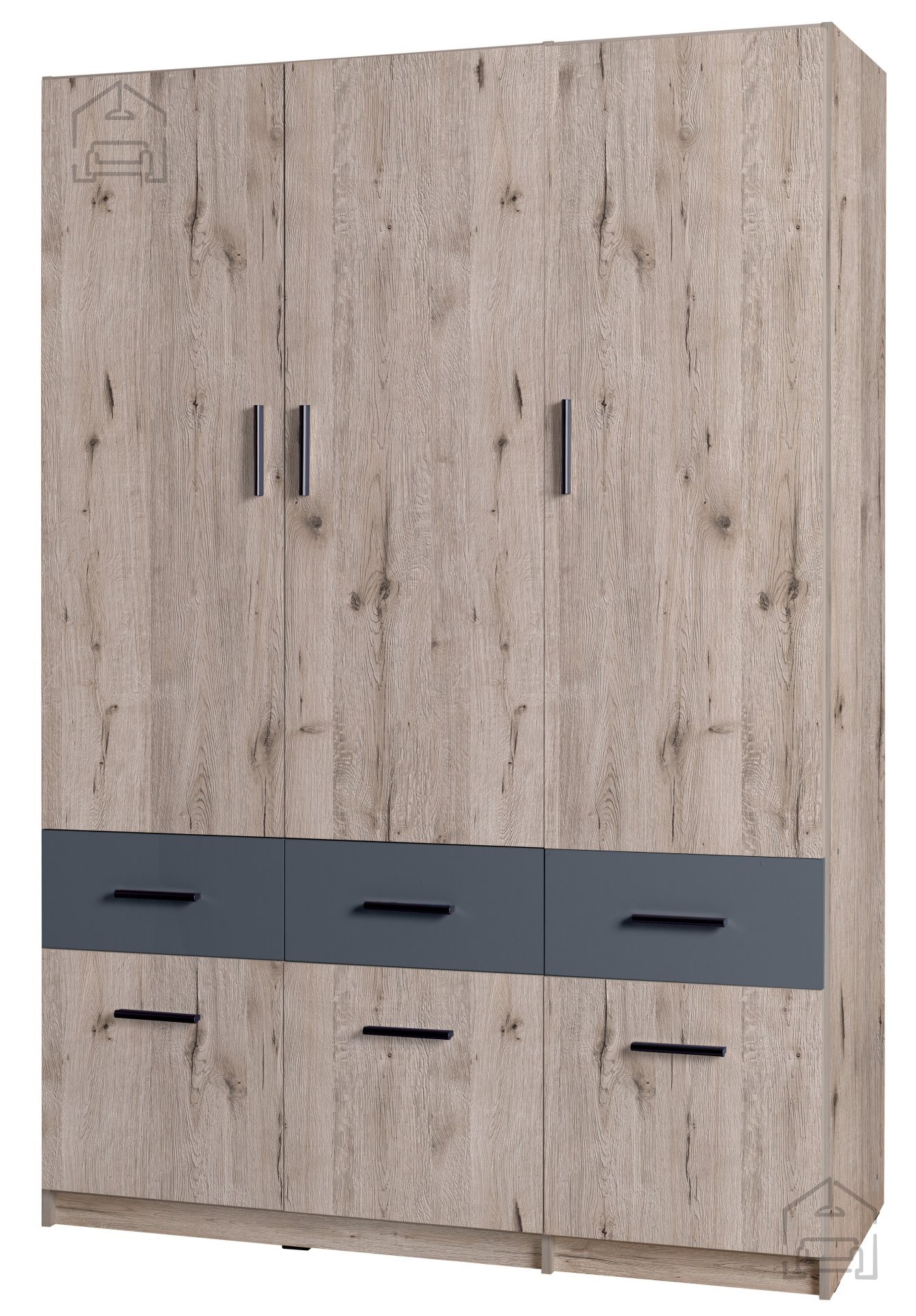 Die perfekte Wahl für alle, die eine praktische, geräumige und zugleich ästhetisch anspruchsvolle Lösung zur Aufbewahrung von Kleidung und Accessoires suchen. Der dreitürige Kleiderschrank mit Schubladen in der Farbkombination Eiche Wellington und Graphit vereint modernes Design mit hoher Funktionalität und passt perfekt in jedes Zuhause. Präzise aus hochwertigen Materialien gefertigt, wird er Ihnen viele Jahre dienen und dafür sorgen, dass Ihr Schlafzimmer, Ihre Diele oder Ihr Ankleidezimmer stets ordentlich und übersichtlich bleiben.