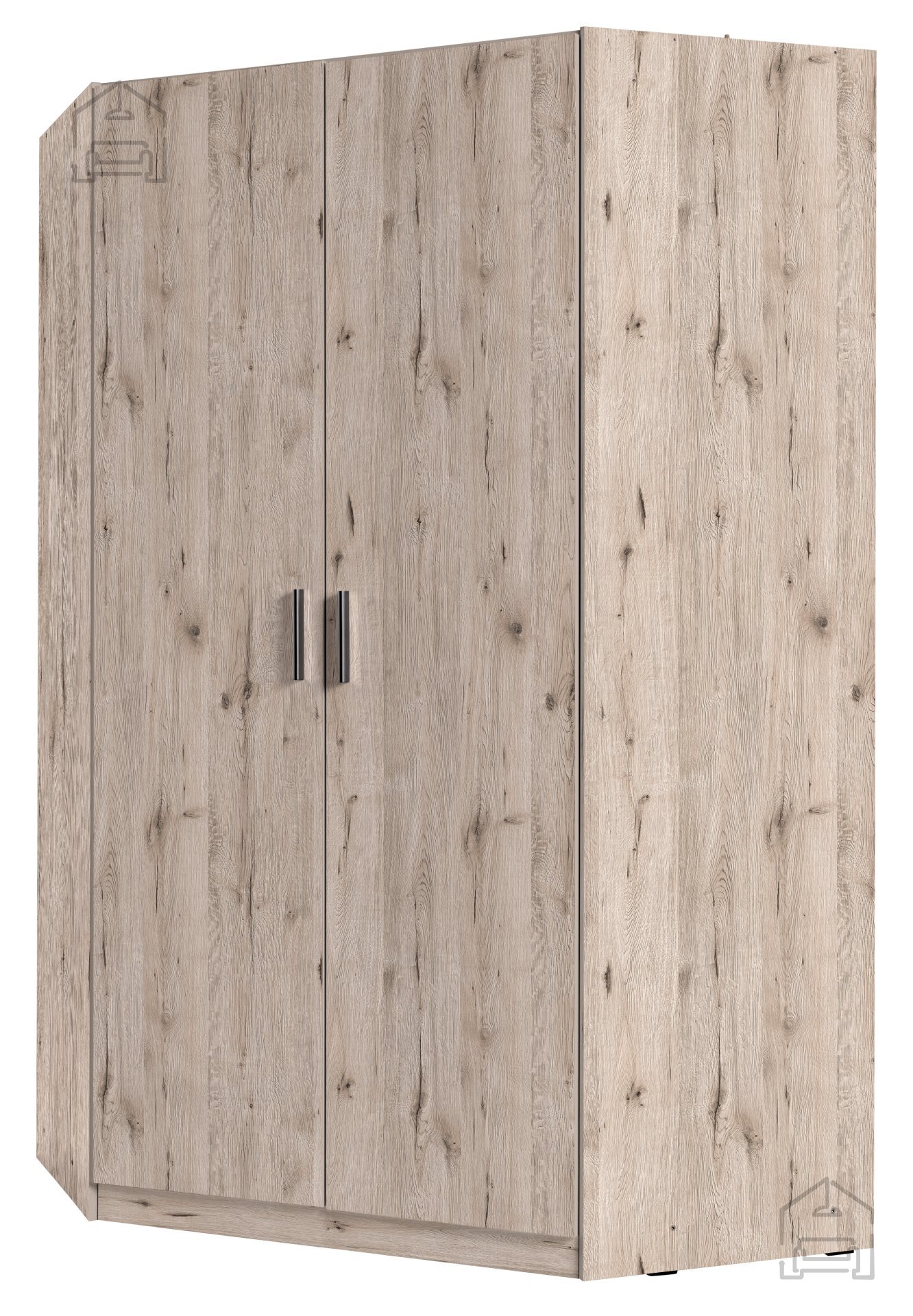 Die Maße 117x117x198 cm ermöglichen es, dass sich der Schrank ideal in die Ecke des Raumes einfügt und so eine ansonsten ungenutzte Ecke ausnutzt. Die Doppeltüren ermöglichen einen einfachen Zugang zum Inneren, wo Sie Kleidung, Schuhe, Accessoires oder sogar Bettwäsche aufbewahren können. Dank der laminierten 16 mm starken Platte ist die Konstruktion robust und stabil, während die Rückwand aus HDF-Platte zusätzliche Unterstützung und Haltbarkeit bietet.