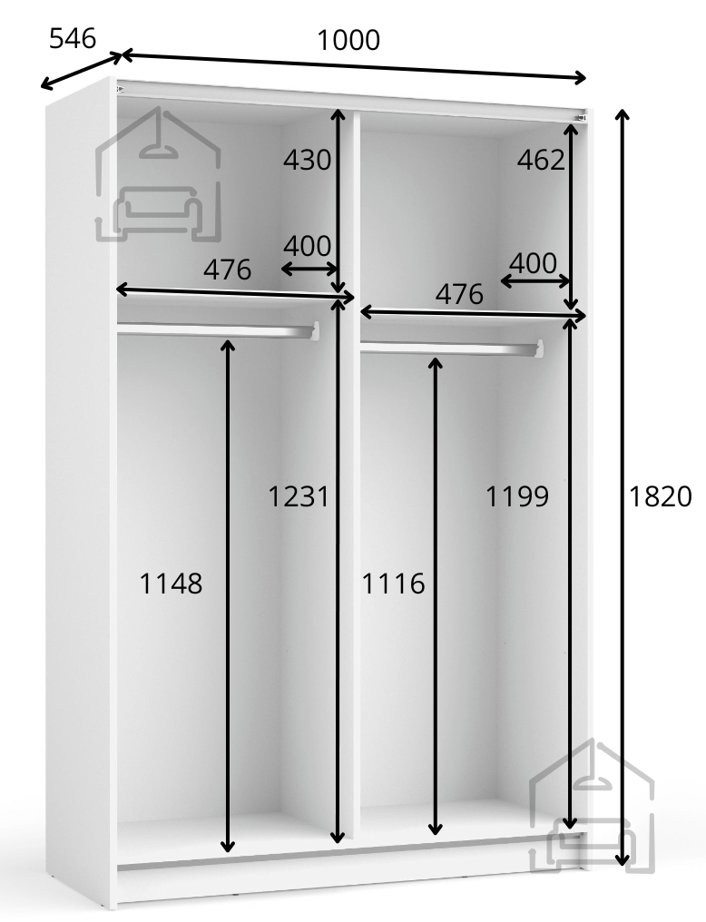 Die Maße 100x54,5x182 cm ermöglichen es, den Schrank problemlos auch in kleineren Schlafzimmern, Fluren oder Ankleideecken zu platzieren. Die Schiebetüren sind die ideale Lösung für Räume, in denen jeder Zentimeter wertvoll ist, da sie keinen zusätzlichen Platz zum Öffnen benötigen. Der große Spiegel, der an den Türen angebracht ist, hat eine doppelte Funktion – er vergrößert den Raum optisch und ermöglicht es gleichzeitig, Ihr Aussehen zu überprüfen, bevor Sie das Haus verlassen.