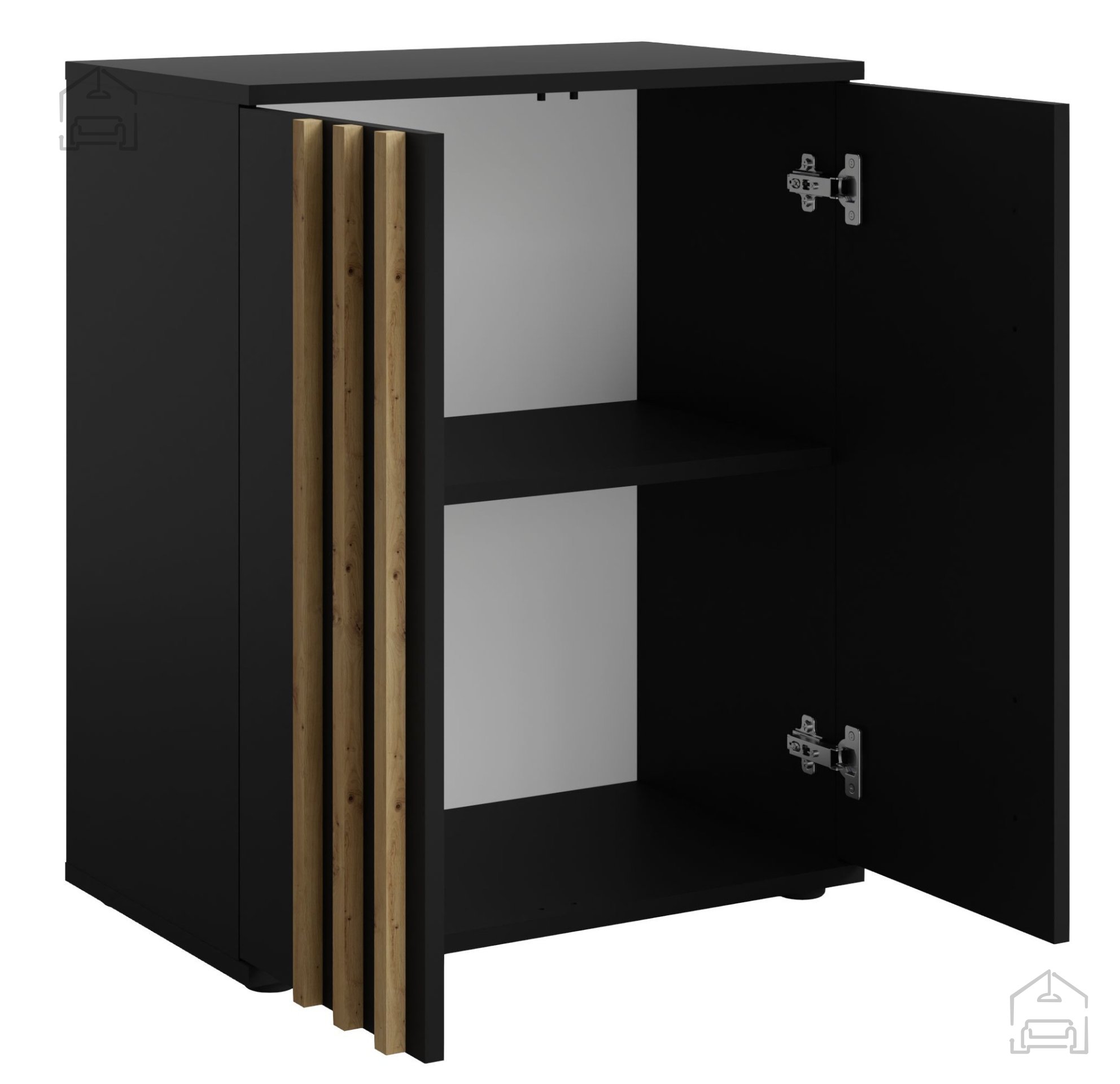 Die schwarze Kommode mit Details in der Farbe Eiche Artisan ist mehr als nur ein Aufbewahrungsmöbel – sie ist ein Stück, das den Charakter des Raumes betont. In modernen Interieurs sticht sie als eleganter Blickfang hervor, in klassischen schafft sie einen angenehmen Kontrast. Besonders schön harmoniert sie mit Accessoires in natürlichen Tönen, Metallelementen oder helleren Holzoberflächen. Auf das obere Regal können Sie dekorative Elemente wie Vasen, Bilderrahmen oder Zimmerpflanzen stellen und so eine angenehme und persönliche Atmosphäre schaffen.