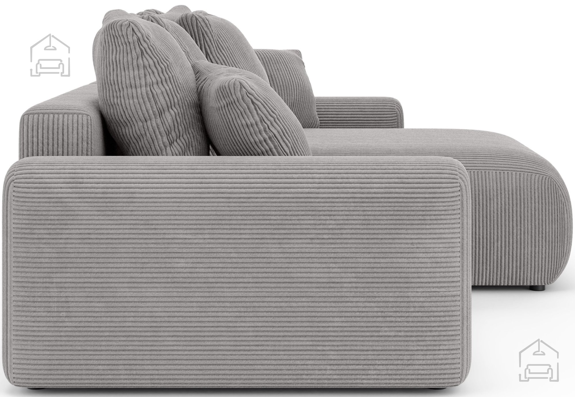 Diese moderne Eckwohnlandschaft vereint Ästhetik und Funktionalität. Sie ist im minimalistischen Stil gestaltet, der gut zu verschiedenen Einrichtungsstilen passt – vom skandinavischen bis zum modernen urbanen Ambiente. Hergestellt aus hochwertigen Materialien wie Spanplatten, MDF, HDF, Massivholz und Sperrholz, garantiert sie Stabilität und eine lange Lebensdauer. Die Rückseite ist mit demselben Stoff bezogen wie die Vorderseite, sodass sie überall im Raum platziert werden kann, auch in der Mitte des Wohnzimmers.