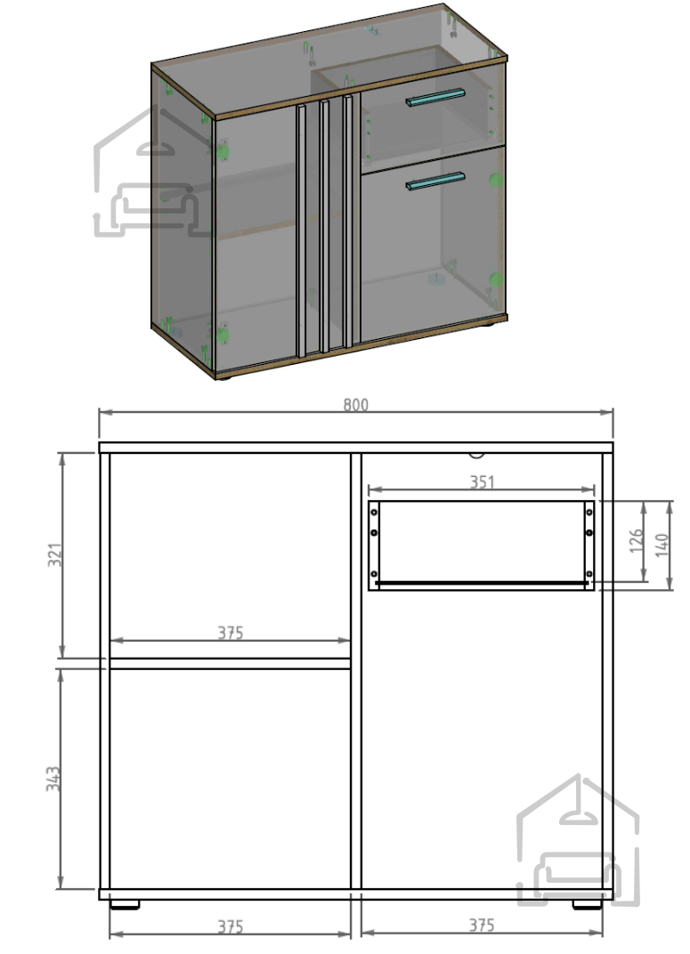 Die Kommode bietet eine Kombination aus zwei Türschränken und einer Schublade, was eine praktische Aufbewahrung verschiedener Gegenstände ermöglicht – von Dokumenten und Textilien bis hin zu dekorativen Accessoires. Dank der durchdachten Innenaufteilung behalten Sie stets den Überblick über Ihre Sachen, während Ihr Raum ordentlich und ästhetisch ansprechend bleibt.