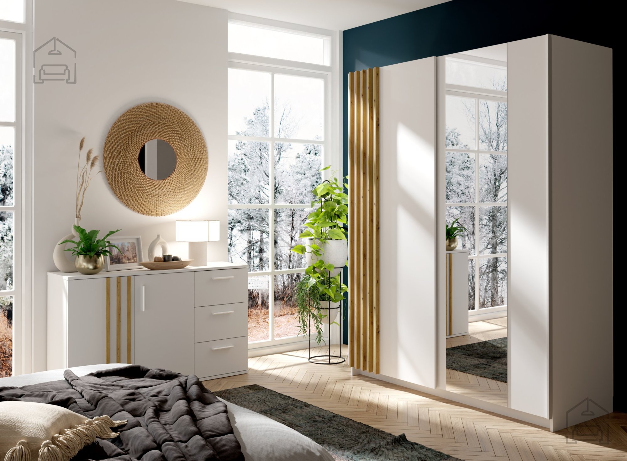 Die Kombination aus Weiß und warmen Holzelementen schafft ein zeitloses Erscheinungsbild, das sowohl mit modernem, minimalistischem Stil als auch mit klassischeren Interieurs harmoniert. Leisten aus MDF in der Farbe Eiche Artisan sorgen für einen subtilen Kontrast, der dem Raum einen Hauch von Natürlichkeit und Wärme verleiht. Seine Vielseitigkeit ermöglicht eine einfache Kombination mit bestehenden Möbeln und Accessoires, unabhängig von der Farbpalette des Raumes.
