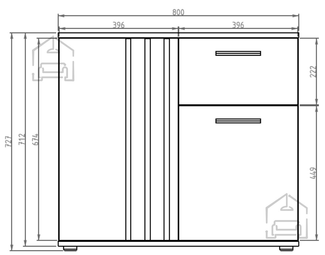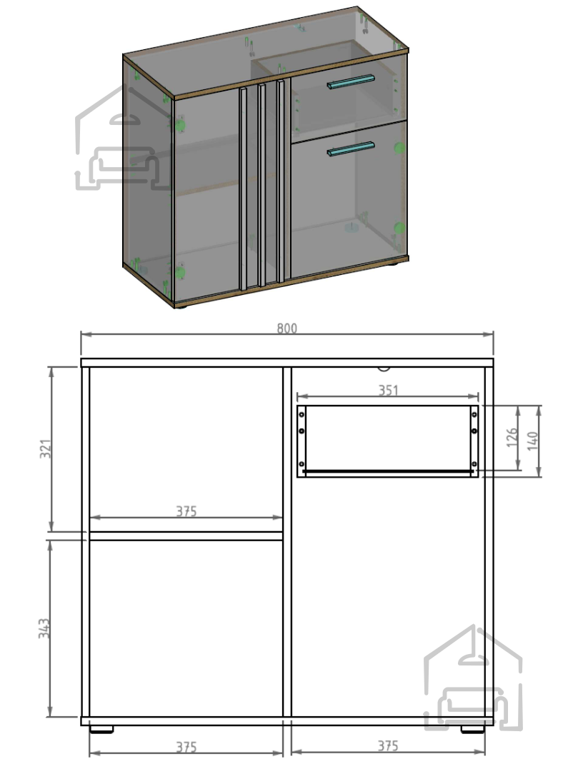 Im Inneren finden Sie geräumige Türen und eine Schublade, die sich mit Hilfe von zuverlässigen Kugelführungen öffnen lässt. Die Schublade ermöglicht ein sanftes und leises Öffnen, was zu einer komfortablen Nutzung beiträgt. Die Rückseite der Kommode besteht aus einer HDF-Platte mit einer Stärke von 3 mm, was Stabilität und ein ansprechendes Aussehen auch von hinten gewährleistet.