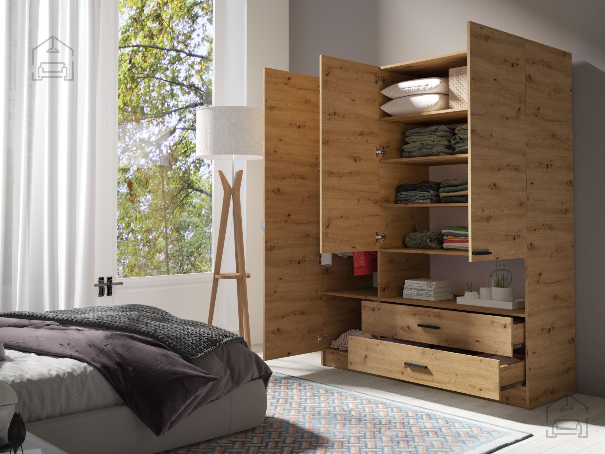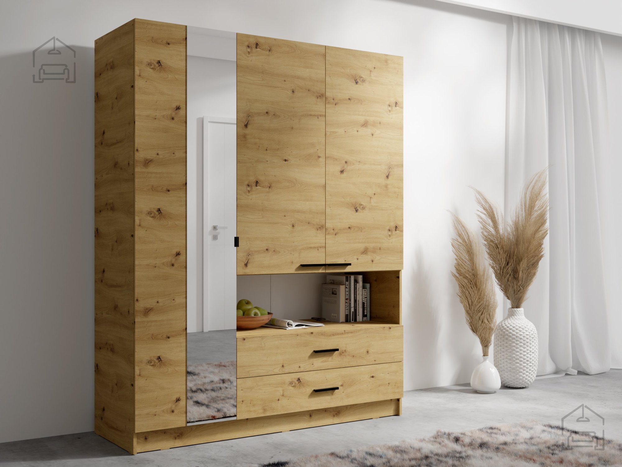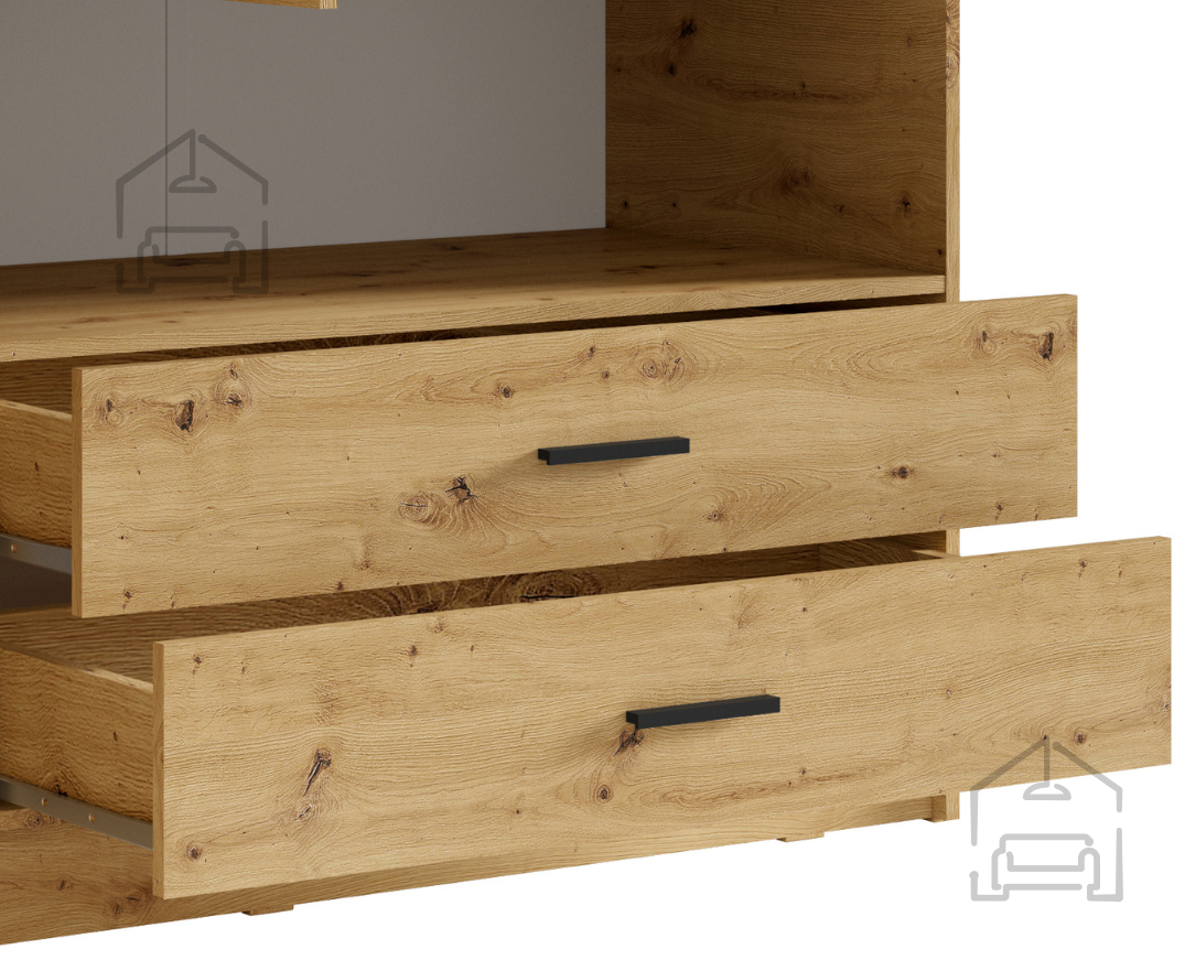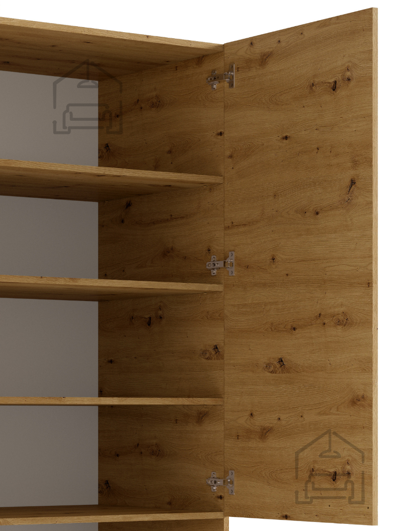 Die Artisan-Eichenfarbe bringt mit ihrer natürlichen Holzstruktur und den warmen Tönen ein Gefühl von Gemütlichkeit und Eleganz in den Raum. Dieser Farbton ist äußerst beliebt in modernen Interieurs, da er sich leicht mit verschiedenen Farbpaletten kombinieren lässt – von hellen minimalistischen Räumen bis hin zu reicheren, rustikalen Umgebungen. Der Schrank passt sich problemlos vorhandenen Möbeln an und wirkt in jedem Raum als ästhetisch vollendetes Element.