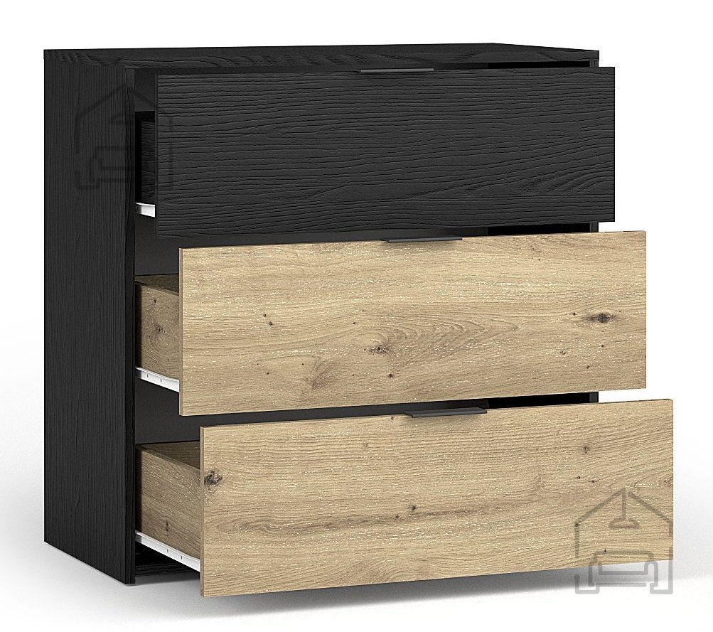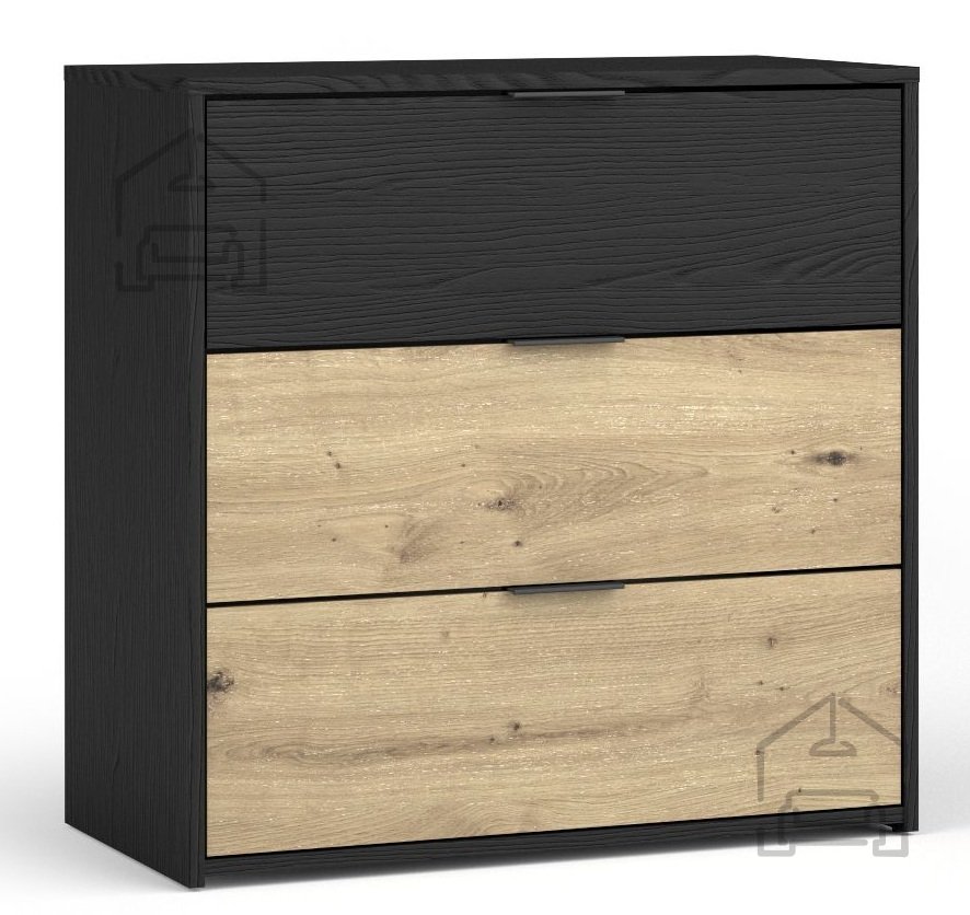 Die Kommode in der Farbkombination aus schwarzem Graphit und Eiche Artisan ist mehr als nur ein praktisches Möbelstück – sie ist eine durchdacht gestaltete Lösung, die Funktionalität, Eleganz und Nachhaltigkeit vereint. Mit ihrer modernen Form und dem Kontrast zwischen dunklen und warmen Holztönen bringt sie in jeden Raum ein Gefühl von Ordnung, Wärme und Prestige. Die Maße 80x40x80 cm ermöglichen, dass die Kommode sowohl in kleinere als auch größere Räume perfekt passt, ohne an Funktionalität zu verlieren.
