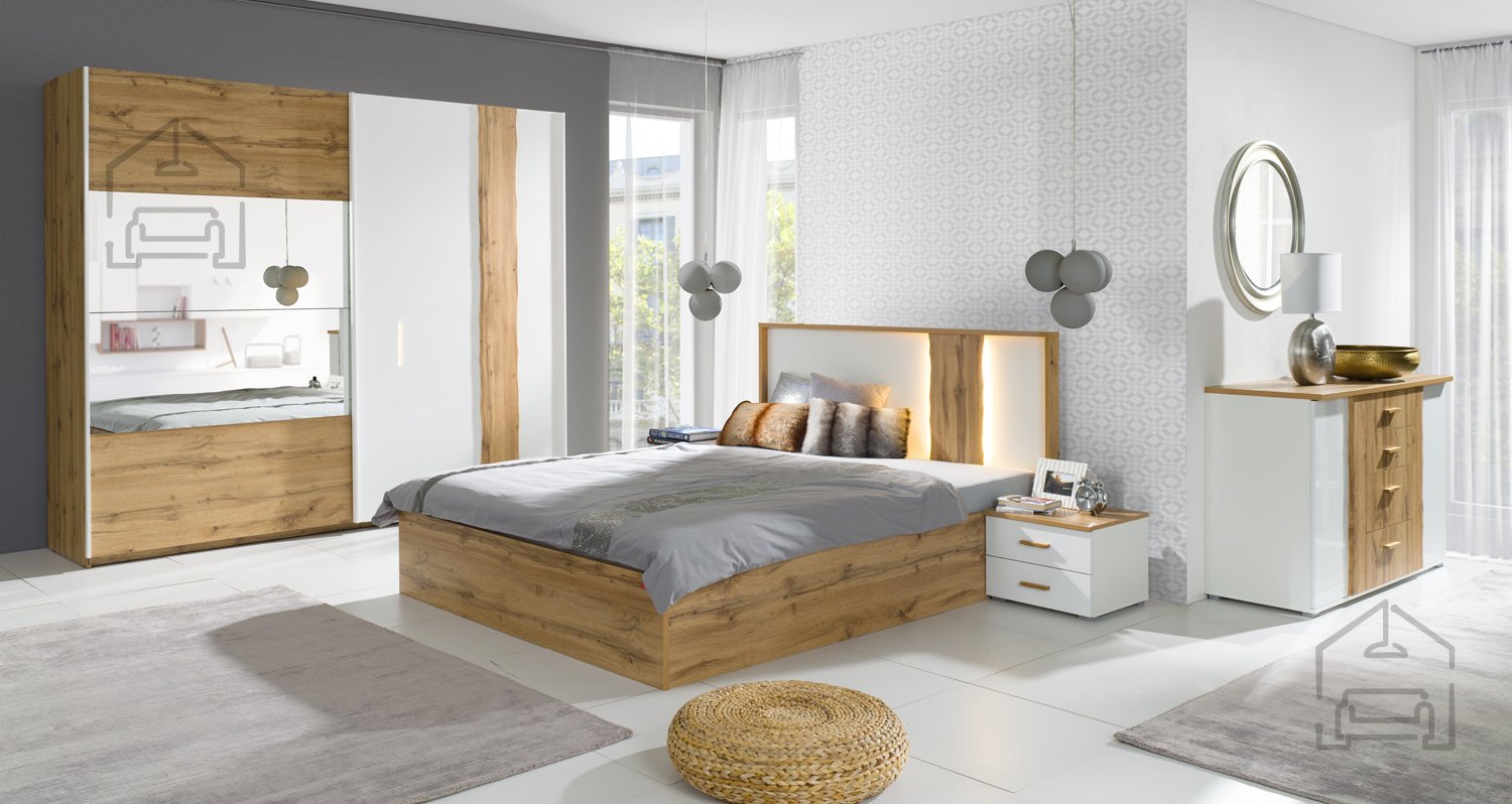 Schaffen Sie eine perfekte Oase der Ruhe und des Komforts in Ihrem Zuhause mit einem modernen und funktionalen Schlafzimmer, das die Wärme der natürlichen Holzoptik und die Eleganz heller Oberflächen vereint. Mit sorgfältig ausgewählten Materialien und präziser Verarbeitung bringt dieses Set Harmonie, Qualität und Praktikabilität, die Sie für den angenehmen Alltag benötigen. Die Kombination der Farbe Eiche Wotan und Weiß schafft einen modernen Kontrast, der sowohl in kleinere als auch größere Räume passt und dem Raum zugleich ein Gefühl von Frische und Geräumigkeit verleiht.