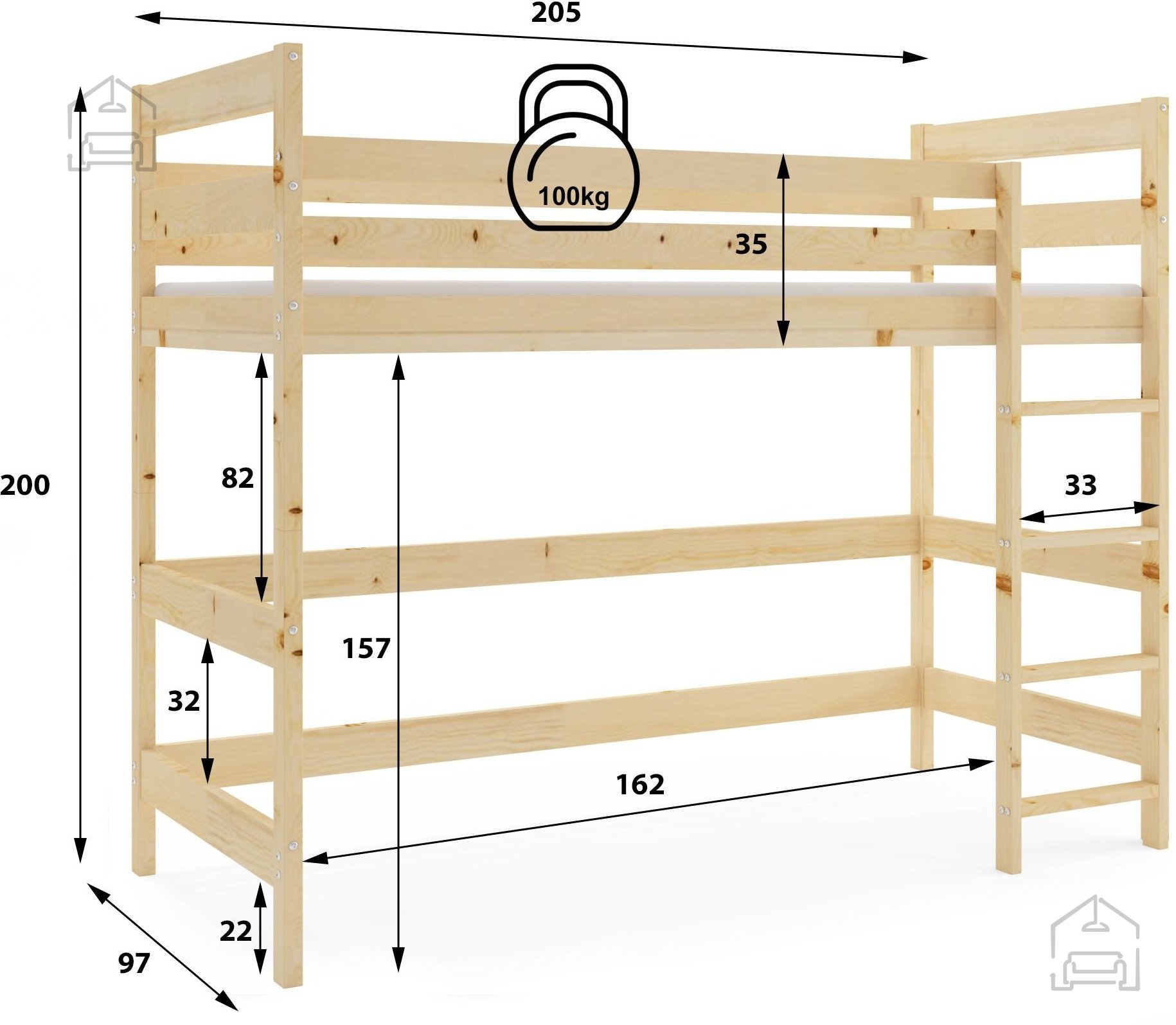 Das Bett ist besonders für Kinder und Jugendliche geeignet, da es Sicherheit, Komfort und Funktionalität vereint. Das Sicherheitsgeländer sorgt für einen unbeschwerten Schlaf, und die hypoallergene Matratze gewährleistet eine gesunde Schlafumgebung. Dank der Tragfähigkeit bis zu 100 kg ist es sowohl für Kinder als auch für Teenager oder sogar Erwachsene geeignet.