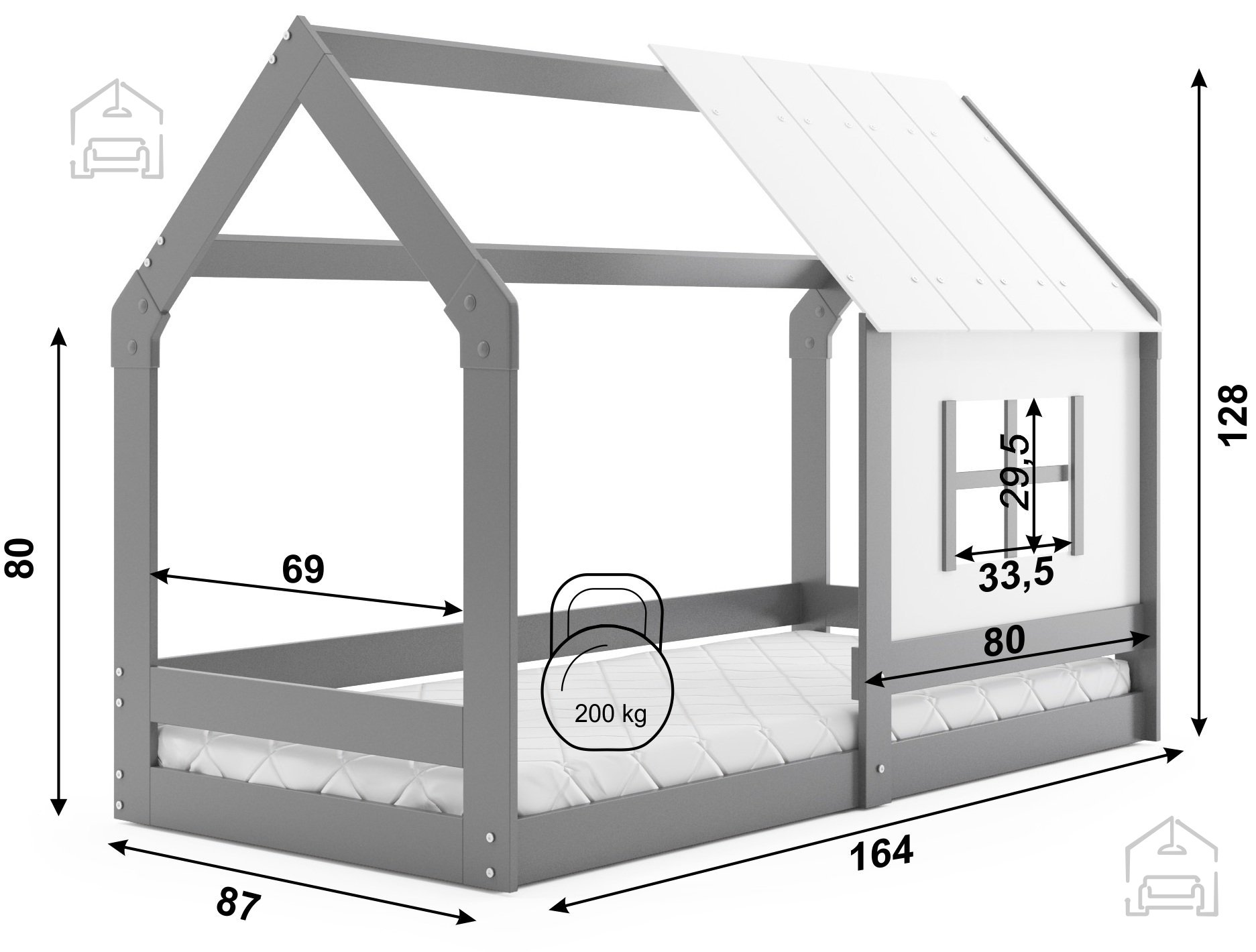 Das Bett ist aus strapazierfähigem Holz gefertigt, das Stabilität und eine lange Lebensdauer gewährleistet. Die Graphit/weiße Farbe verleiht dem Raum Frische und passt perfekt zu verschiedenen Einrichtungsstilen – von klassisch bis modern. Mit seinen Maßen 87x164x128 cm ist es für Kinder jeden Alters geeignet, da es einen bequemen Schlaf ermöglicht und gleichzeitig nicht zu viel Platz im Zimmer einnimmt. Dank des dachförmigen Aufsatzes verwandelt sich das Bett in eine gemütliche Ecke, in der das Kind seine Fantasie entwickelt, eigene Geschichten erfindet und sich sicher fühlt.