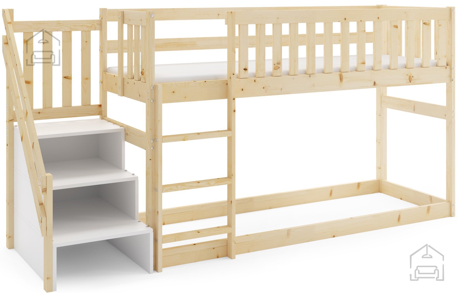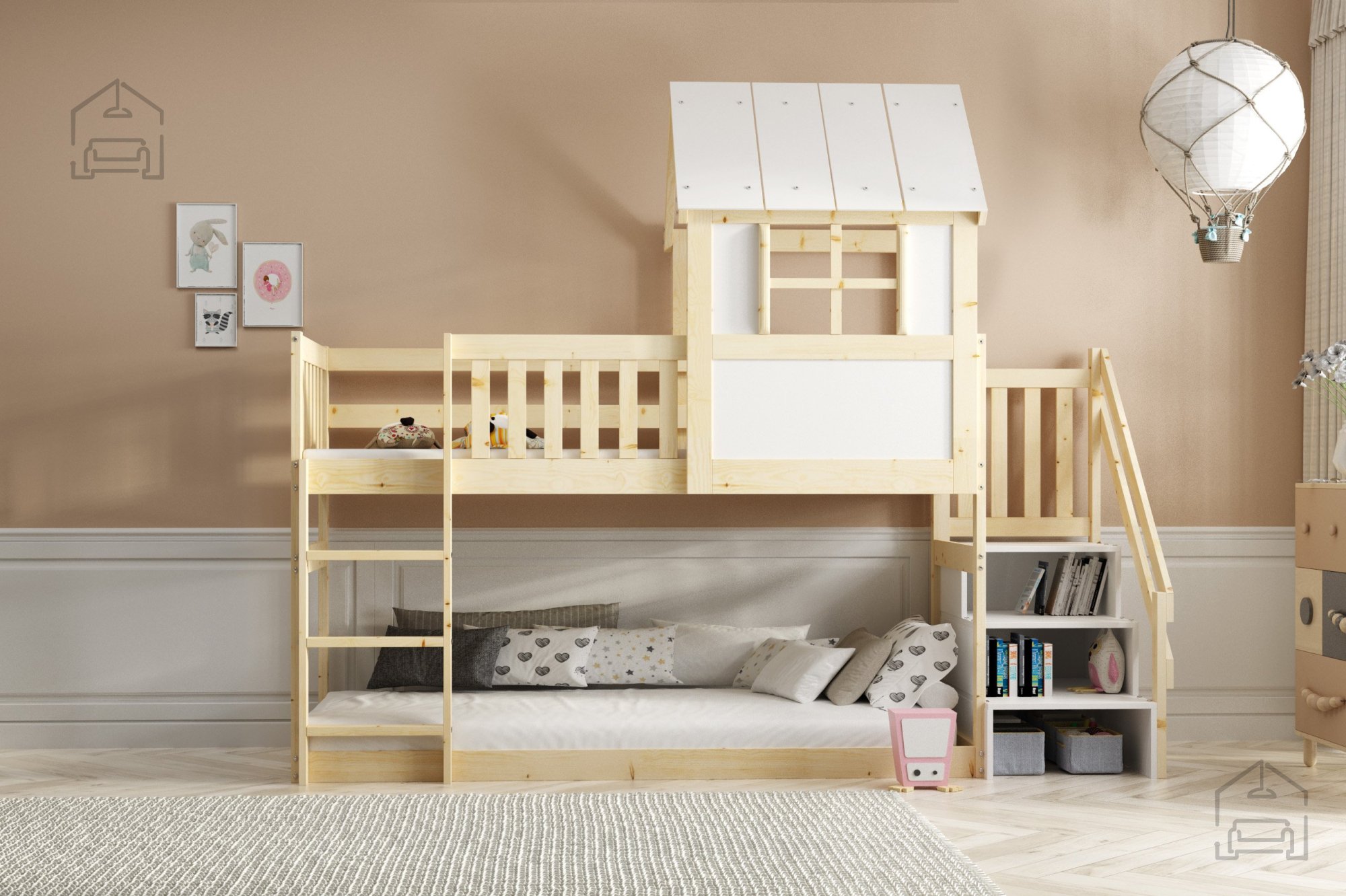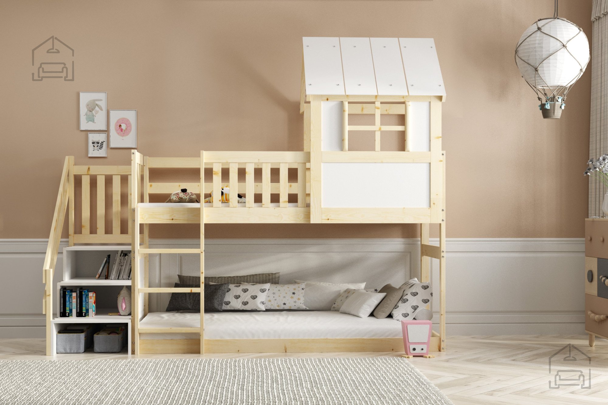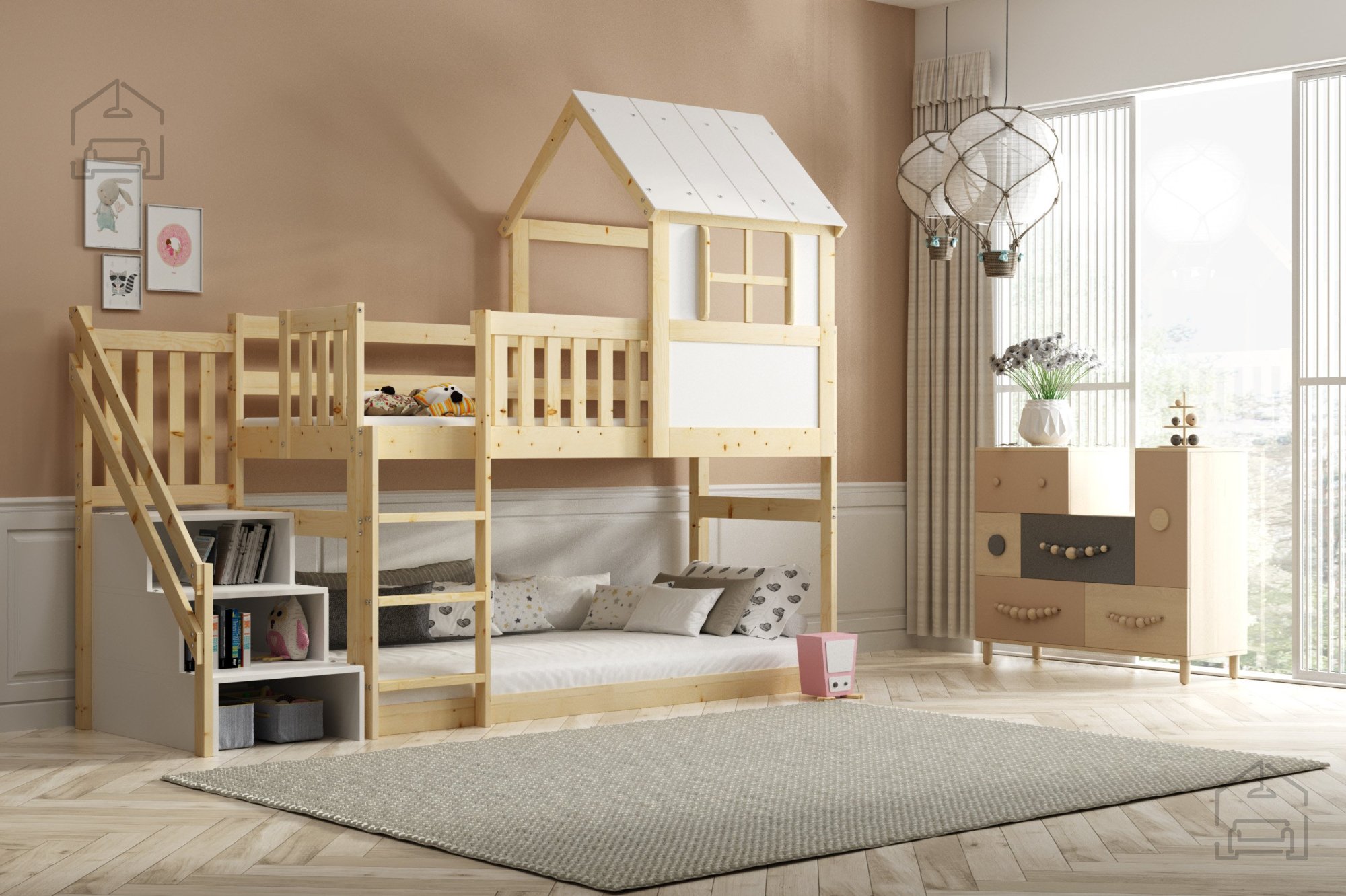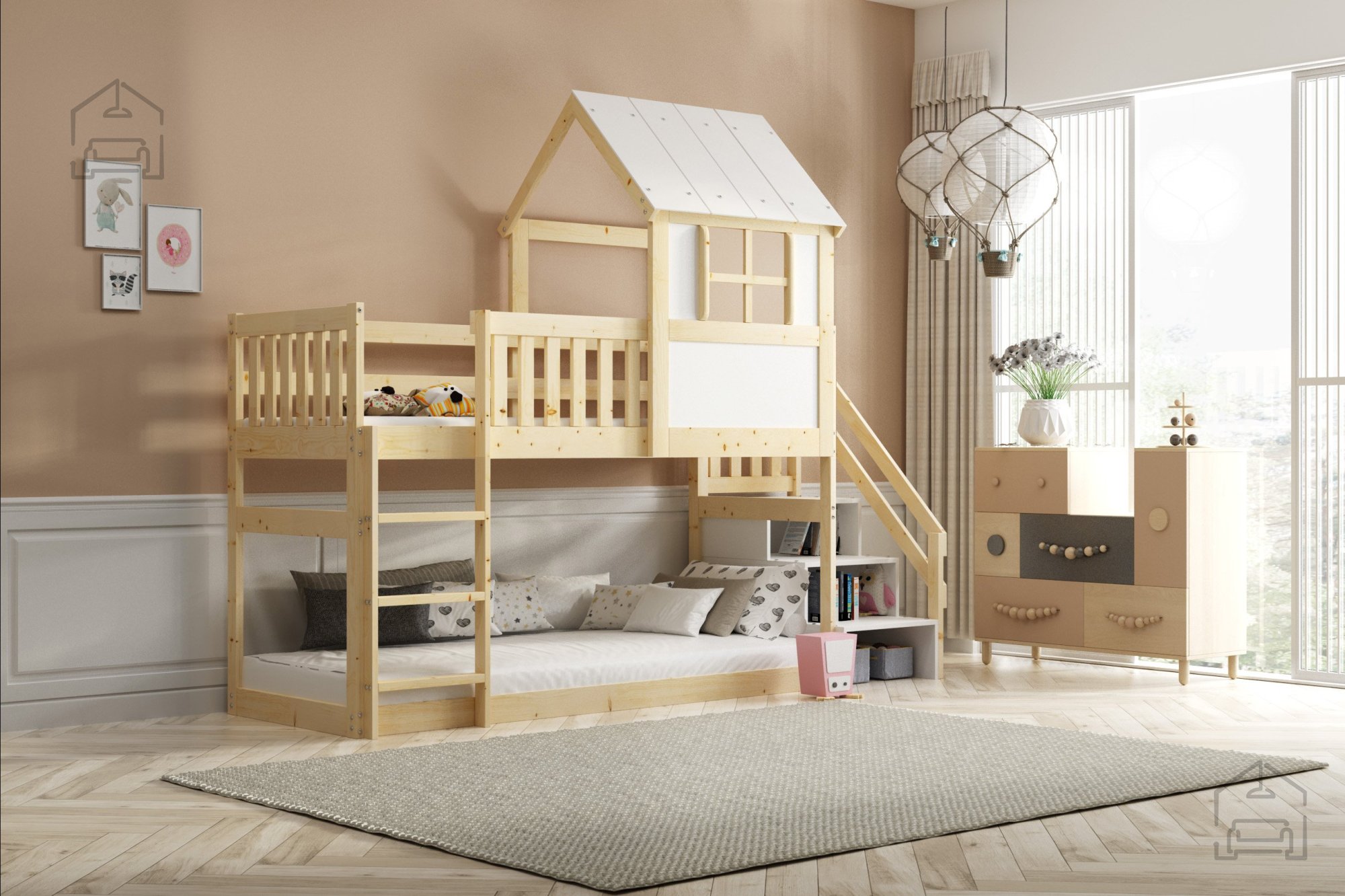 Das Besondere an diesem Modell ist seine Form im Stil eines Häuschens, die eine angenehme und sichere Umgebung schafft, in der sich Kinder entspannt fühlen. Die natürliche Farbe der Kiefer bringt Wärme in den Raum und passt gut zu verschiedenen Einrichtungsstilen – vom modernen Minimalismus bis zum ländlichen Charme. Die Treppen ermöglichen einen einfachen und sicheren Zugang zum oberen Bett und sorgen gleichzeitig für zusätzliche Stabilität der Konstruktion.