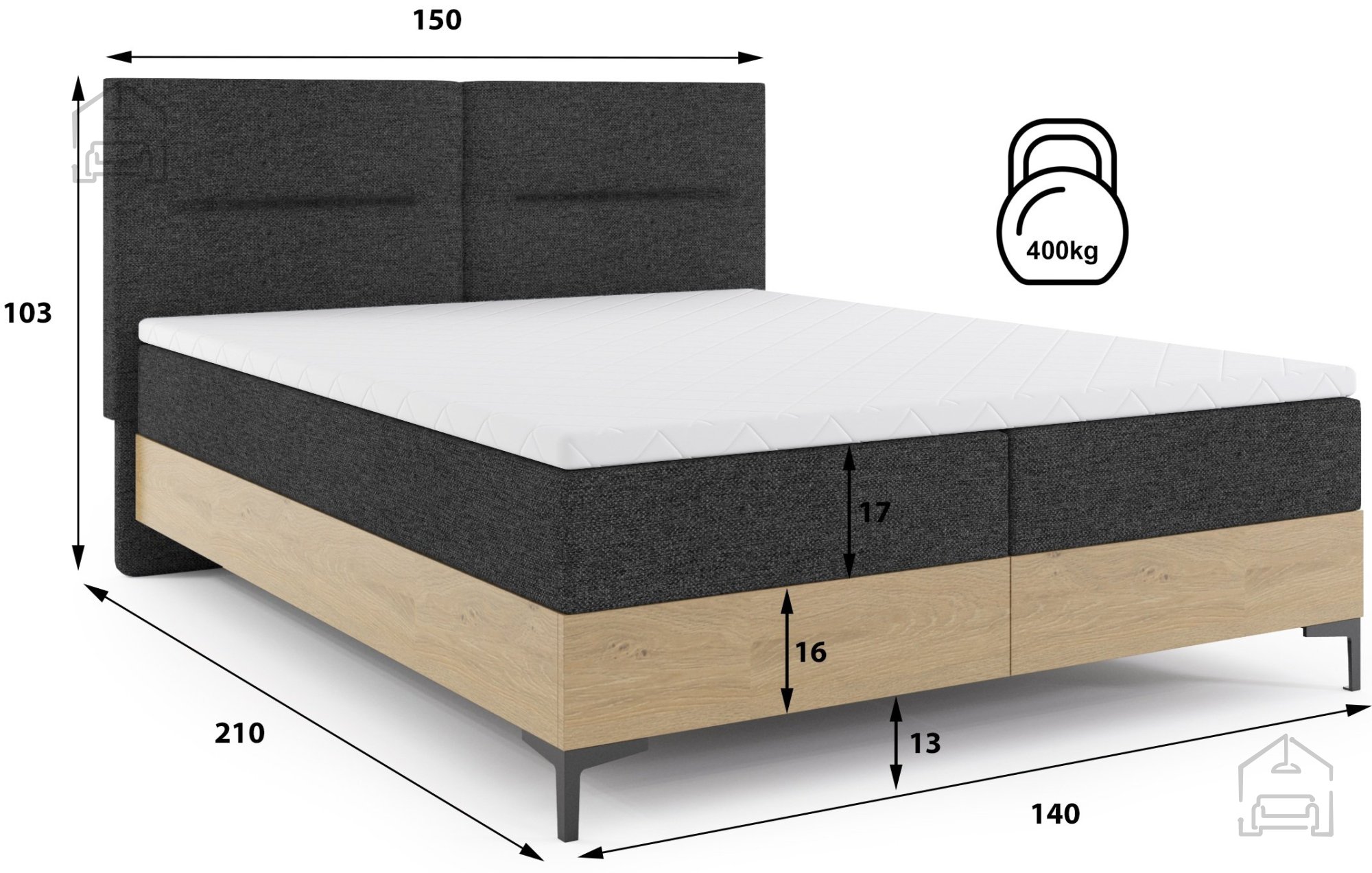 Mit seinen Maßen 150x210x103 cm ist dieses Bett ideal für geräumige Schlafzimmer geeignet, in denen Sie ein Gefühl von Prestige und vollkommenem Komfort schaffen möchten. Aufgrund seiner Höhe und der eleganten Polsterung ist es äußerst praktisch und bietet einen einfachen Zugang zur Liegefläche. Die Farbkombination Kiefer/Eiche und Graphit ermöglicht es, dass es mit verschiedenen Möbelstücken und Dekoren harmoniert – von minimalistisch bis traditionell.