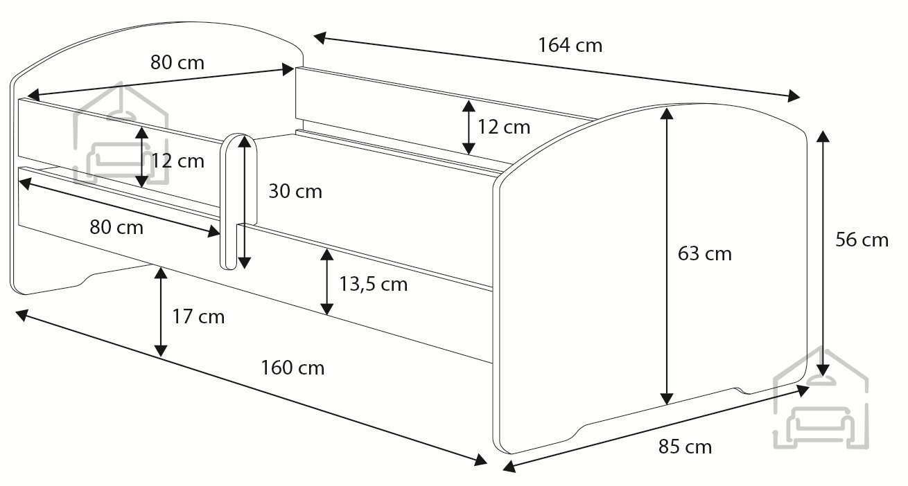 Die Gesamtmaße des Bettes betragen 88x164x63 cm. Damit ist es kompakt genug für kleinere Räume und dennoch geräumig, damit sich Ihr Kind wohlfühlt. Durch das durchdachte Design lässt sich das Bett einfach montieren und pflegen, die Oberfläche ist robust und leicht zu reinigen – ein klarer Vorteil im Kinderzimmer.