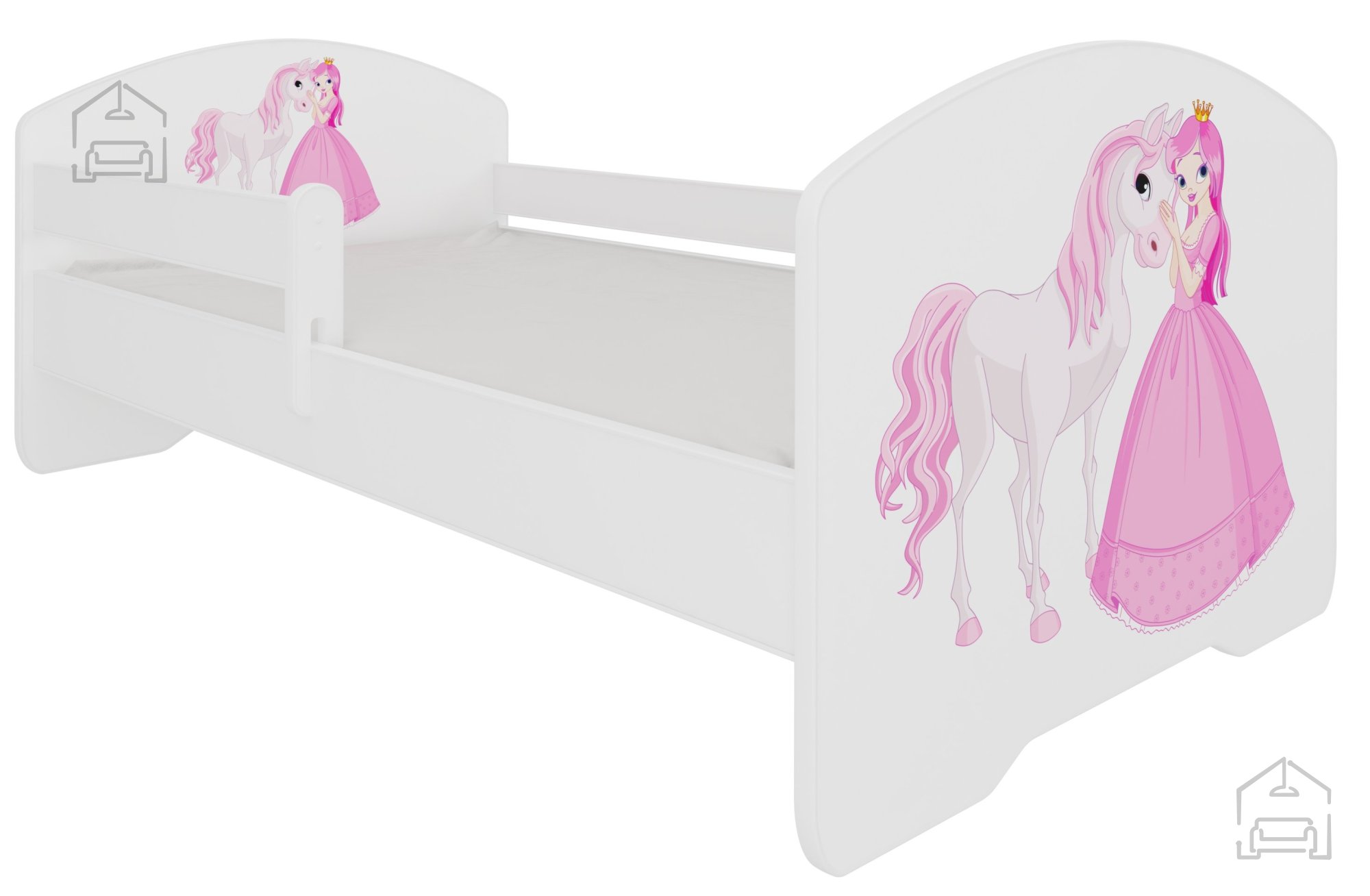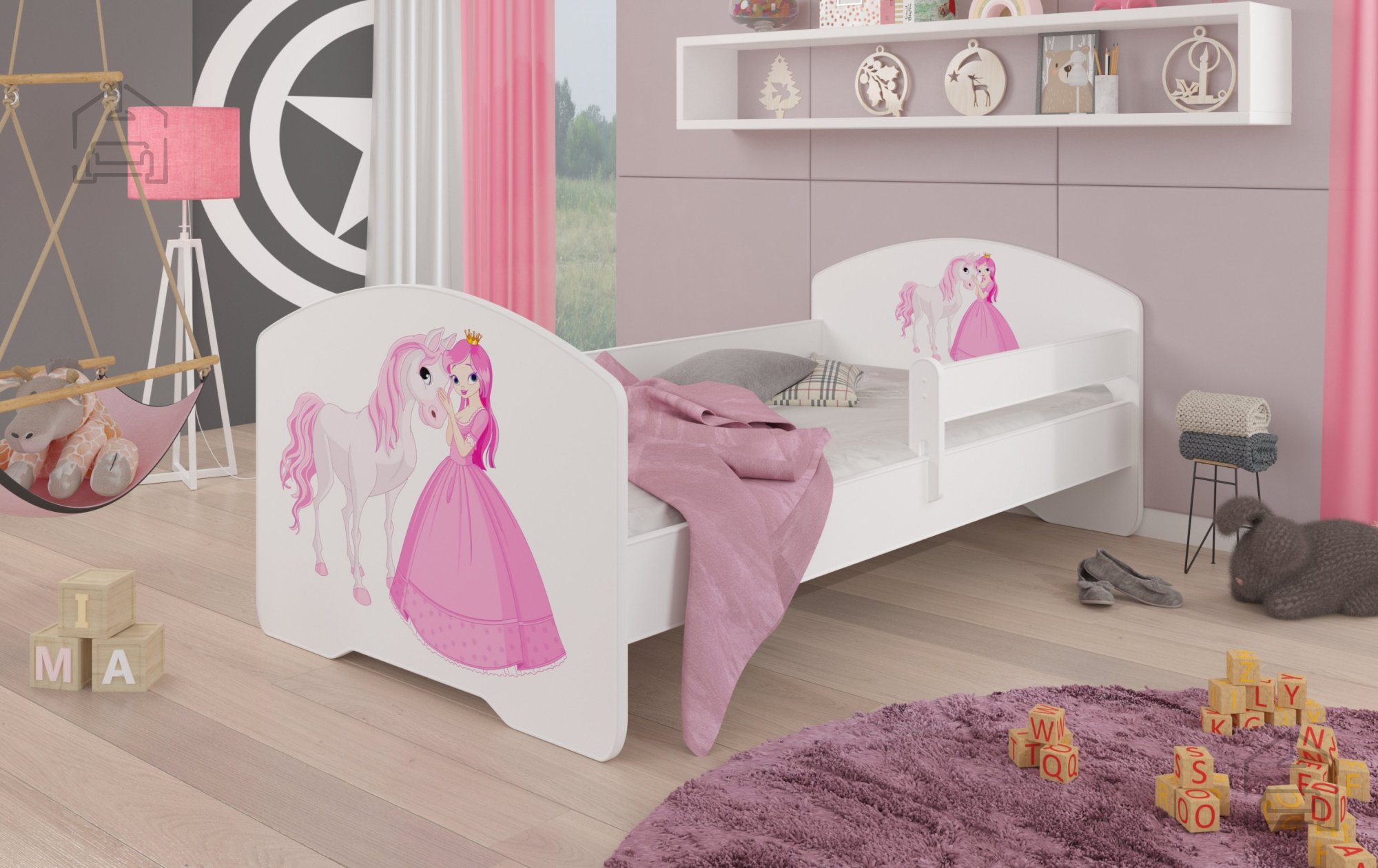 Das Bett ist in klassischem Weiß gehalten und mit einem zarten, verspielten Motiv einer Prinzessin mit Pferd verziert. Diese märchenhafte Illustration regt die Fantasie an und schafft eine gemütliche Umgebung, in der Ihr Kind gerne Zeit verbringt – ob beim Schlafen, Geschichtenlesen oder Spielen. Das ansprechende Design passt harmonisch zu vielen Einrichtungsstilen und ist somit eine wunderbare Wahl für Eltern, die dem Kinderzimmer eine warme, fröhliche Note verleihen möchten.