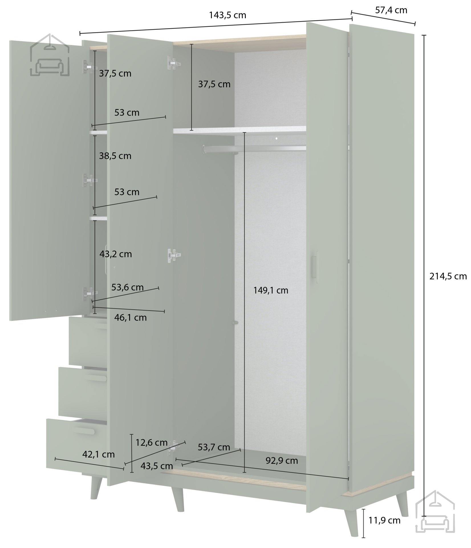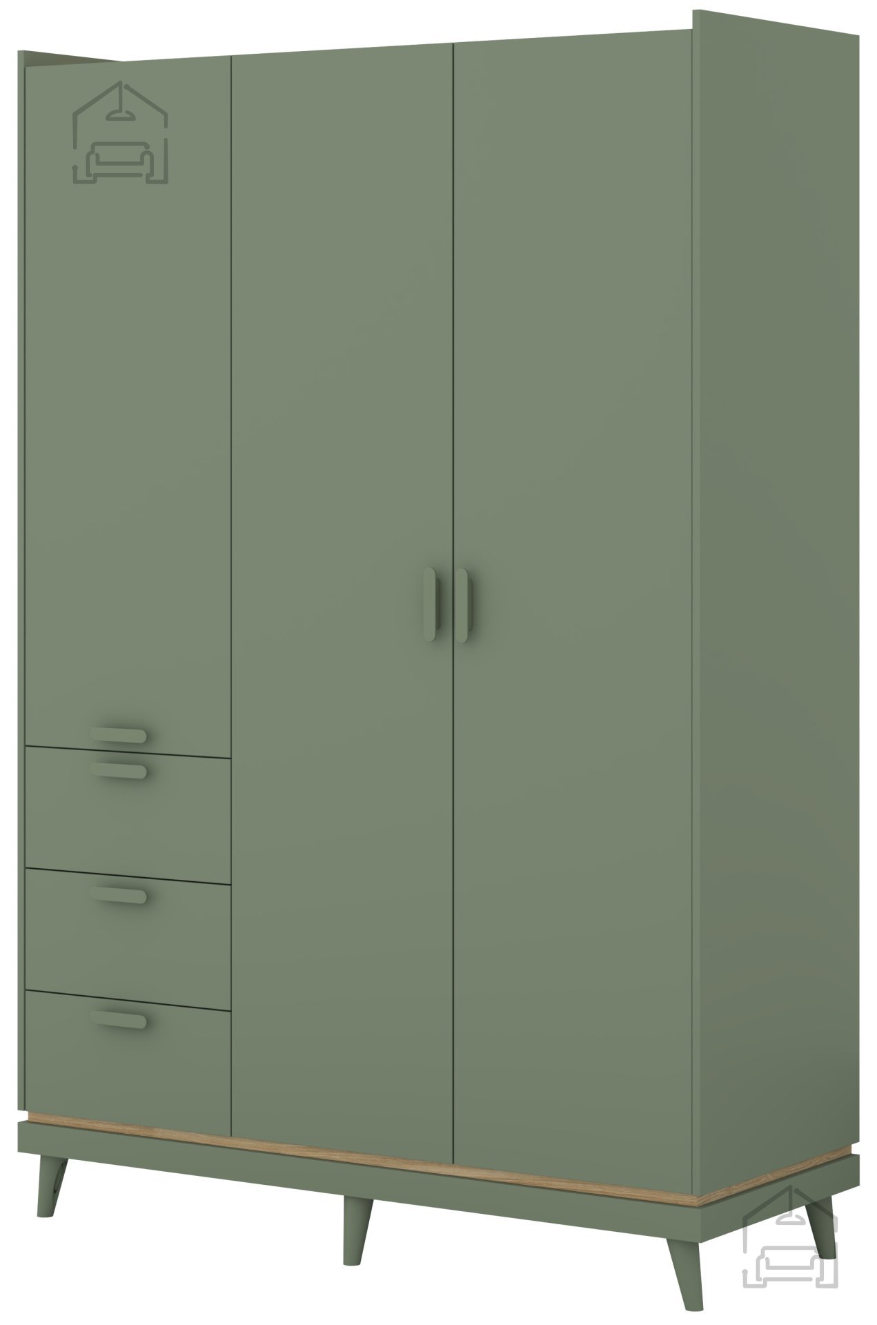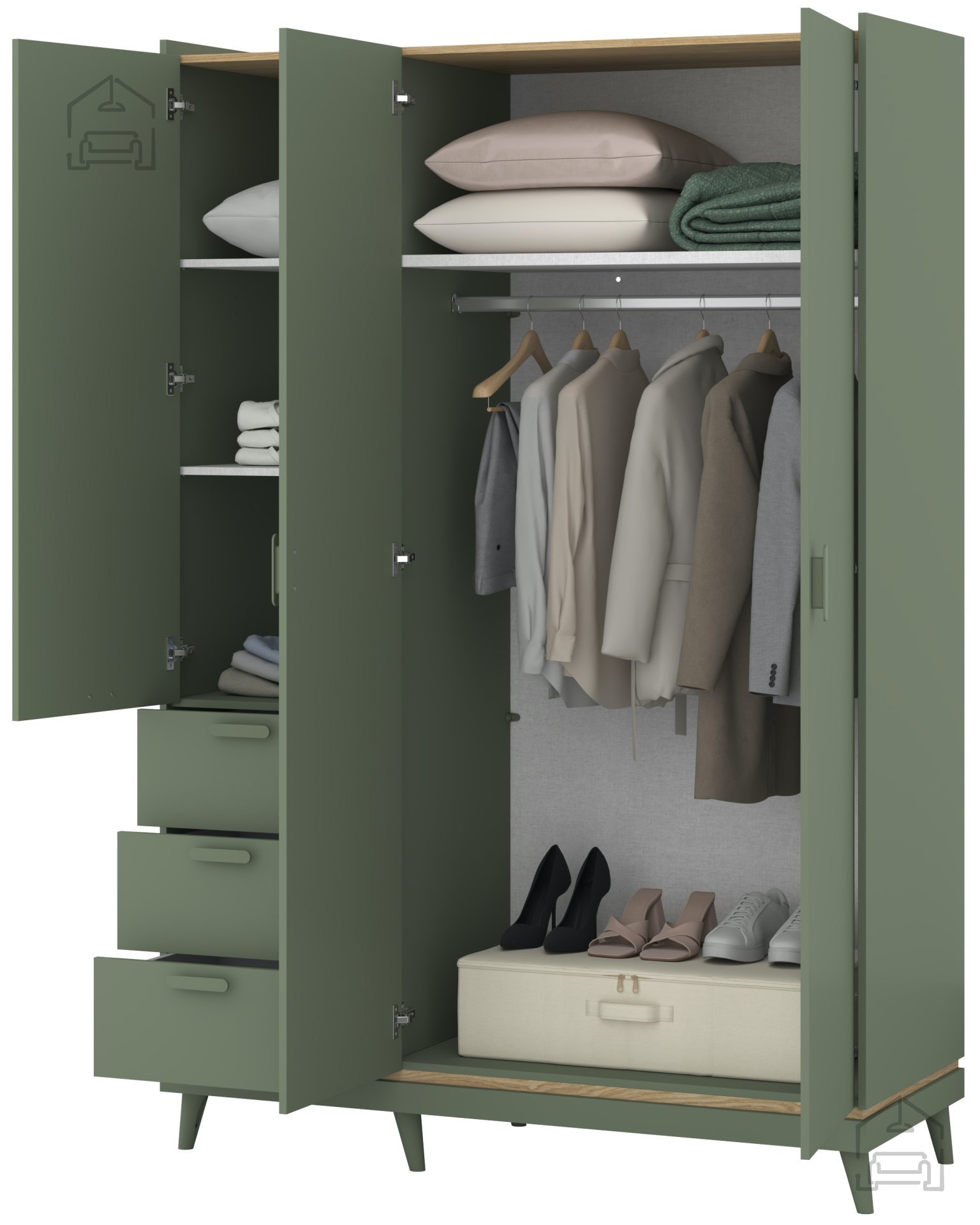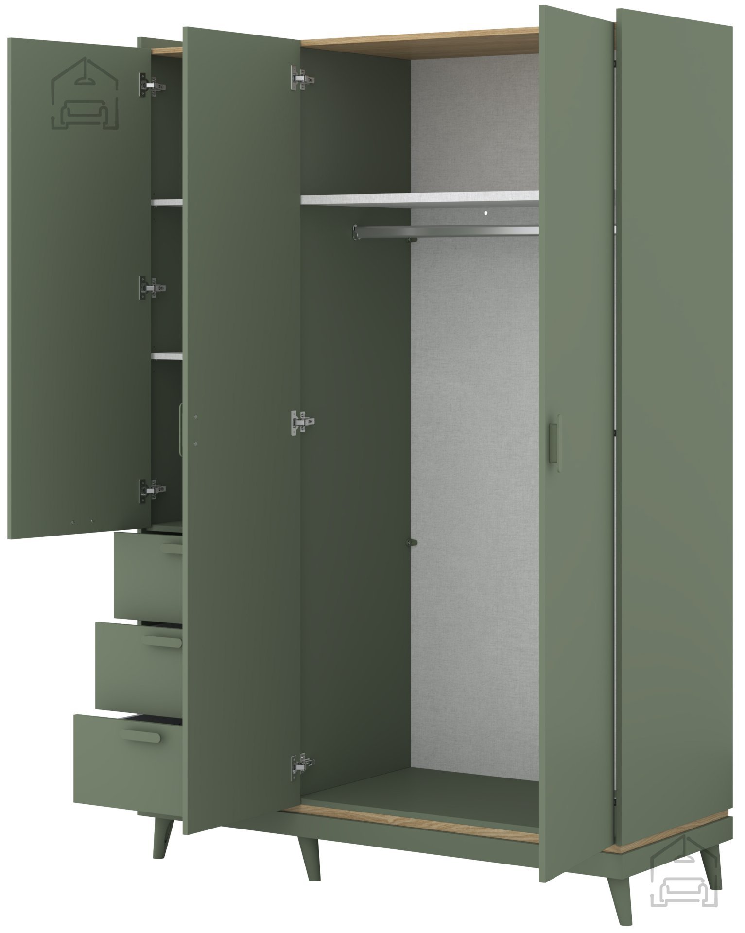 Wenn Sie Möbel suchen, die Design, Funktionalität und Qualität vereinen, ist dieser Kleiderschrank die richtige Entscheidung. Sein Design orientiert sich an aktuellen Wohntrends, bleibt dabei jedoch zeitlos elegant. Durch die neutrale Farbgebung lässt er sich harmonisch mit unterschiedlichen Farbkonzepten kombinieren, während die natürliche Eichenoptik zusammen mit dem Grünton Wärme und Behaglichkeit vermittelt.