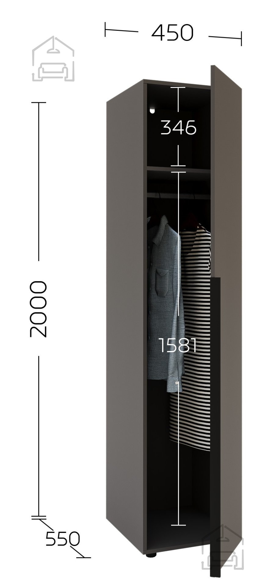 Suchen Sie nach einer praktischen, stilvollen und hochwertigen Lösung, um Kleidung und Accessoires ordentlich zu verstauen? Der einflügelige Kleiderschrank in Graphitgrau ist die perfekte Wahl für alle, die funktionales Möbel mit modernem Touch schätzen. Dank seiner kompakten Maße (45x55x200 cm) passt er auch gut in kleinere Räume und bietet dennoch ausreichend Platz für eine übersichtliche Aufbewahrung. Mit seinem schlichten Design fügt er sich harmonisch in moderne ebenso wie in klassische Einrichtungen ein und eignet sich somit ideal fürs Schlafzimmer, den Vorraum, das Jugendzimmer oder sogar fürs Büro.