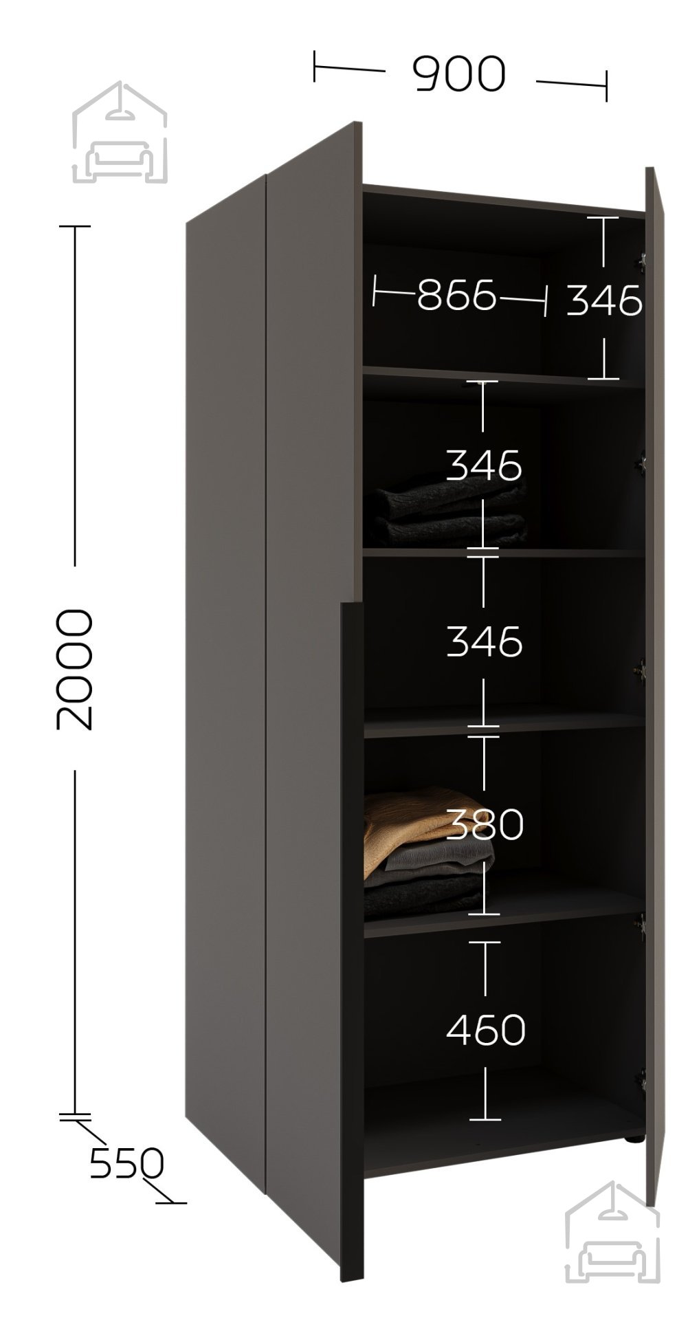Schaffen Sie mehr Platz, Ordnung und Eleganz in Ihrem Zuhause mit einem zweitürigen Kleiderschrank im modernen Graphitgrau, der sich harmonisch in verschiedenste Einrichtungsstile einfügt. Dieser funktionale Schrank ist eine ideale Lösung für Schlafzimmer, Vorzimmer oder Ankleideräume, wo Sie Praktisches mit ansprechendem Design verbinden möchten. Mit seinen Maßen von 90x55x200 cm nutzt er den Raum optimal und bewahrt zugleich eine klare, minimalistische Optik.