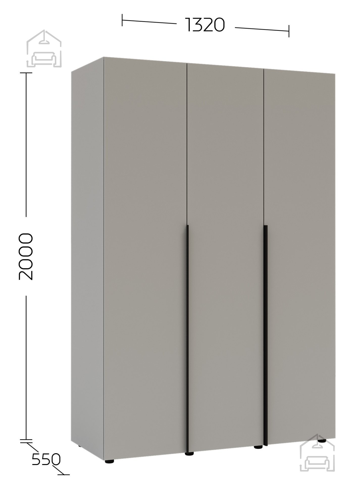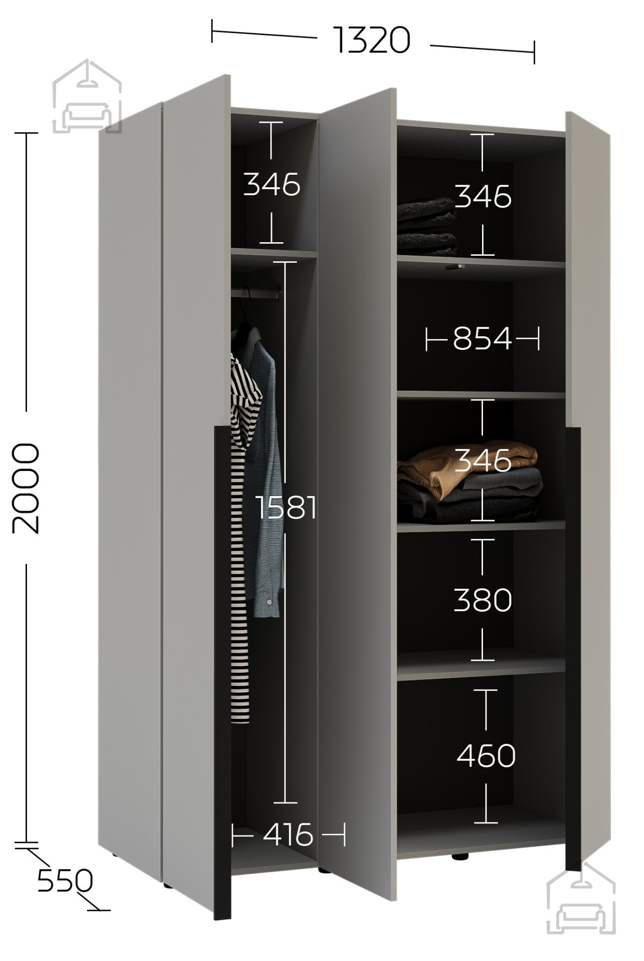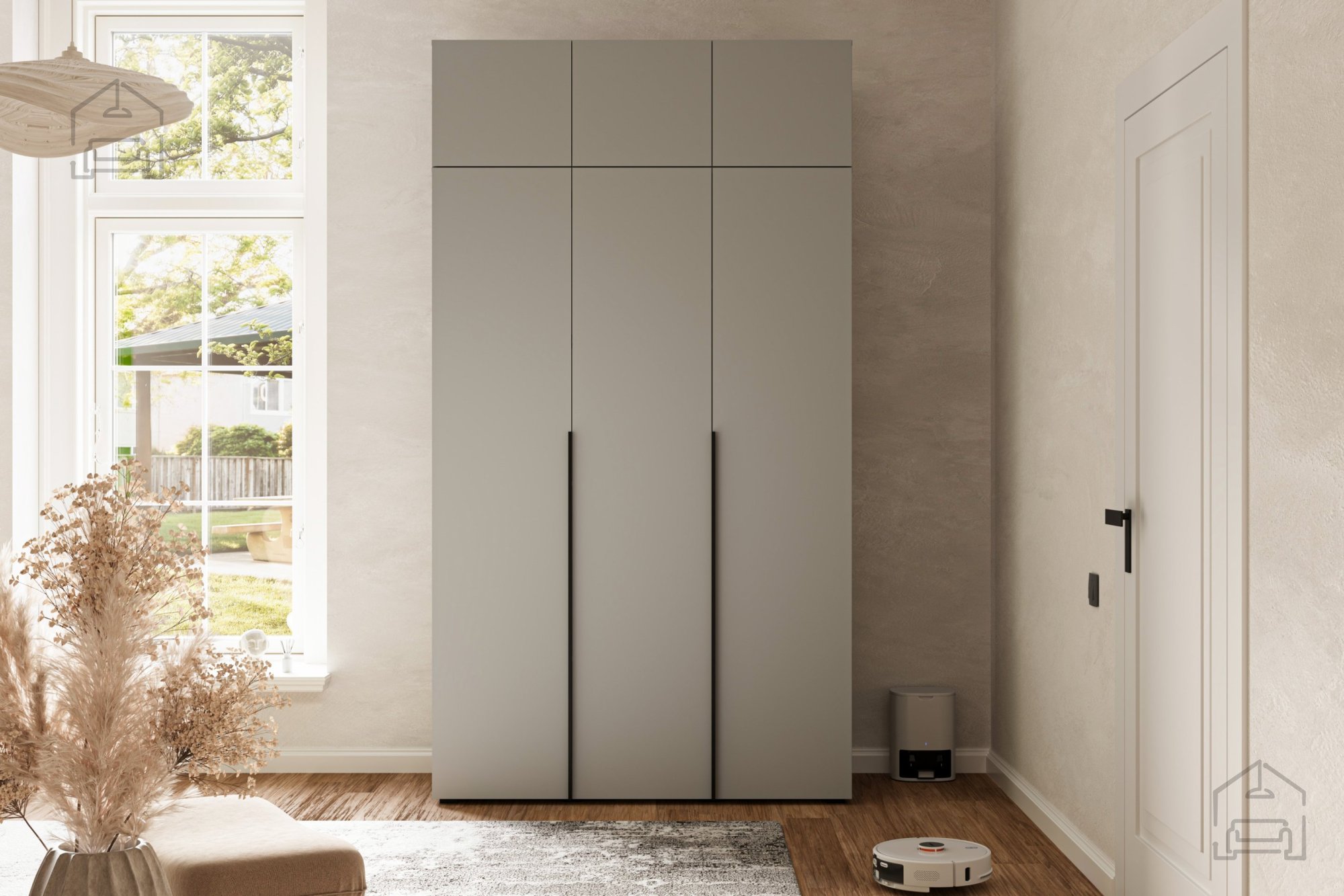 Mit den Maßen 132x55x200 cm nutzt der Schrank den verfügbaren Platz optimal aus. Sein Innenraum ist so gestaltet, dass alles übersichtlich verstaut werden kann – große Bereiche zum Aufhängen von Kleidung, Regalböden für gefaltete Stücke und Platz für Accessoires. Auf Wunsch lässt sich der Schrank mit einem zusätzlichen Aufsatz erweitern, um noch mehr Raum für saisonale Kleidung, Bettwäsche oder Aufbewahrungsboxen zu schaffen.