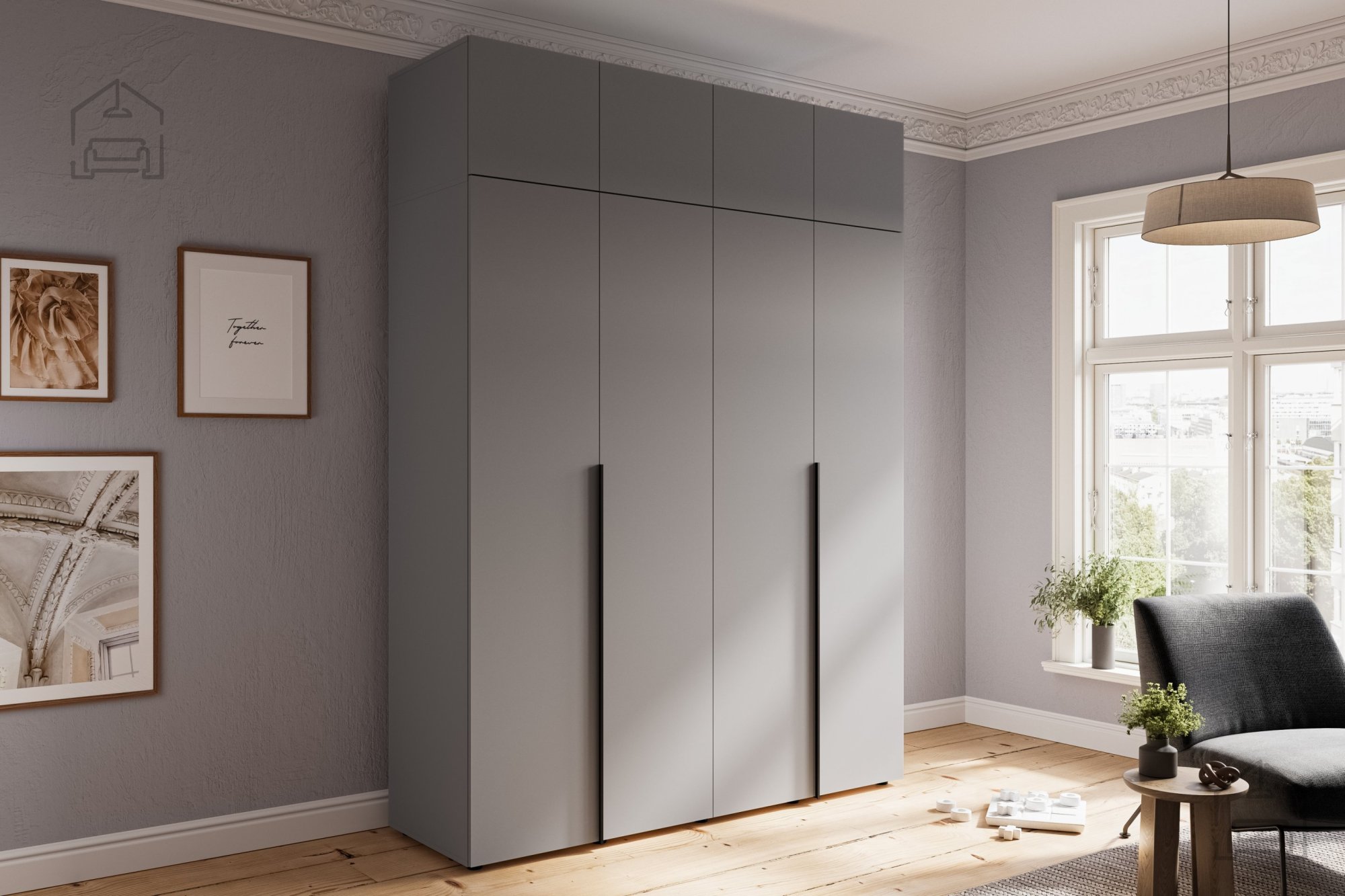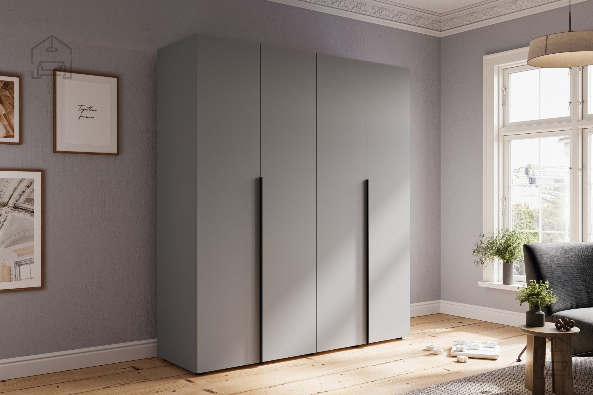 Ordnung ist die Basis für ein gemütliches und harmonisches Zuhause – deshalb zählt der Kleiderschrank zu den wichtigsten Möbelstücken. Er sorgt nicht nur für ausreichend Stauraum, sondern prägt auch das Erscheinungsbild des Raumes. Mit seinem modernen, eleganten Design in ruhigem Grauton wird der viertürige Kleiderschrank Solo 4D Sh zum stilvollen Mittelpunkt Ihres Schlafzimmers, Vorzimmers oder Ankleideraums. Gefertigt wird er in der renommierten Fabrik Garant in Polen, wo hochwertige Verarbeitung, moderne Technologie und viel Gespür für Details zusammenkommen.
