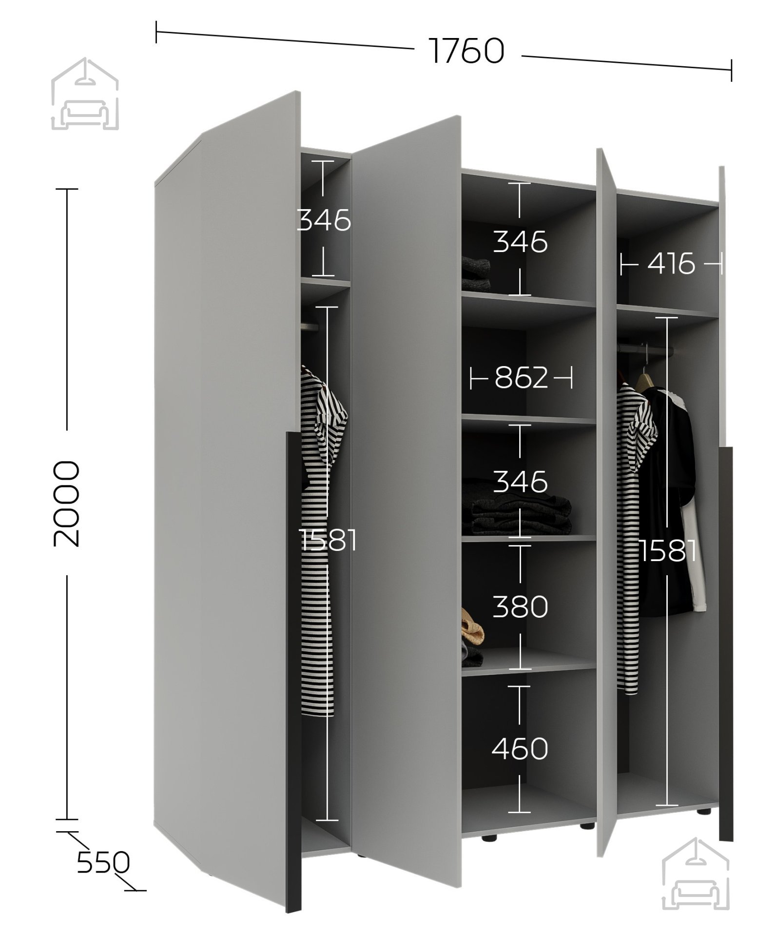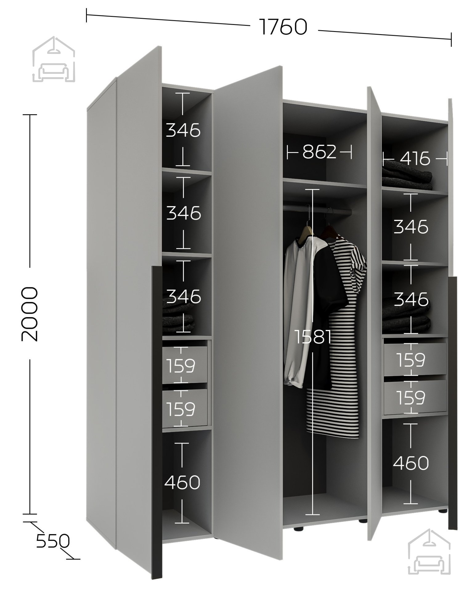 Mit den Maßen 176x55x200 cm nutzt der Schrank den vorhandenen Platz optimal, ohne wuchtig zu wirken. Trotz seiner kompakten Außenmaße bietet er innen großzügigen Stauraum – ideal für Kleidung, saisonale Stücke, Accessoires und Bettwäsche. Dank der durchdachten Aufteilung von Fächern und Kleiderstangen behalten Sie stets den Überblick und haben alles griffbereit.