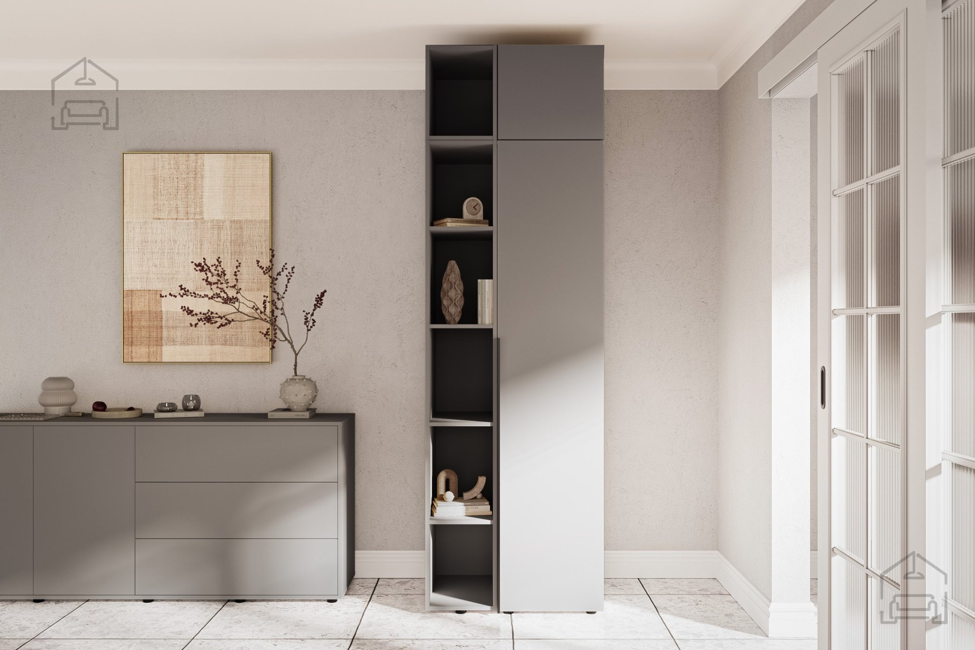 In modernen Wohnräumen, wo sich Ästhetik und Funktionalität vereinen, ist das hohe Regal Solo in Grau die ideale Wahl für alle, die Ordnung, Minimalismus und Qualität schätzen. Mit seinen kompakten Maßen von 55x20x198 cm fügt es sich mühelos in kleinere Wohnungen ebenso wie in größere Wohnzimmer, Büros oder Vorzimmer ein. Die schlanke, aber stabile Bauweise nutzt den vorhandenen Platz optimal und sorgt gleichzeitig für ein modernes Erscheinungsbild, das sich harmonisch mit verschiedenen Einrichtungsstilen – von skandinavisch bis industriell – kombinieren lässt.