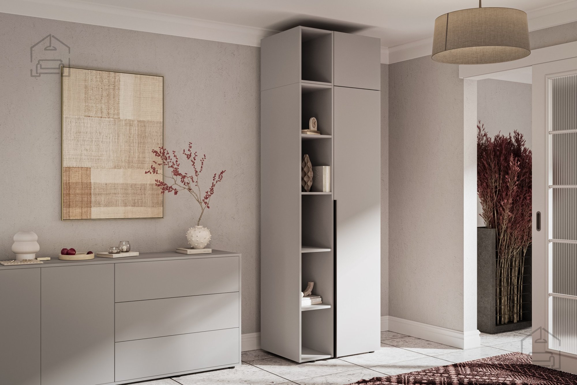 Dieser Aufsatz ist nicht nur eine Ergänzung zum Regal, sondern auch eine clevere Möglichkeit, Stauraum und Ordnung zu schaffen. Darauf lassen sich Dekoartikel, Bücher, Bilderrahmen oder Pflanzen schön in Szene setzen und verleihen dem Raum eine persönliche Note. So entsteht eine warme, einladende Atmosphäre, während die Raumhöhe optimal genutzt wird.