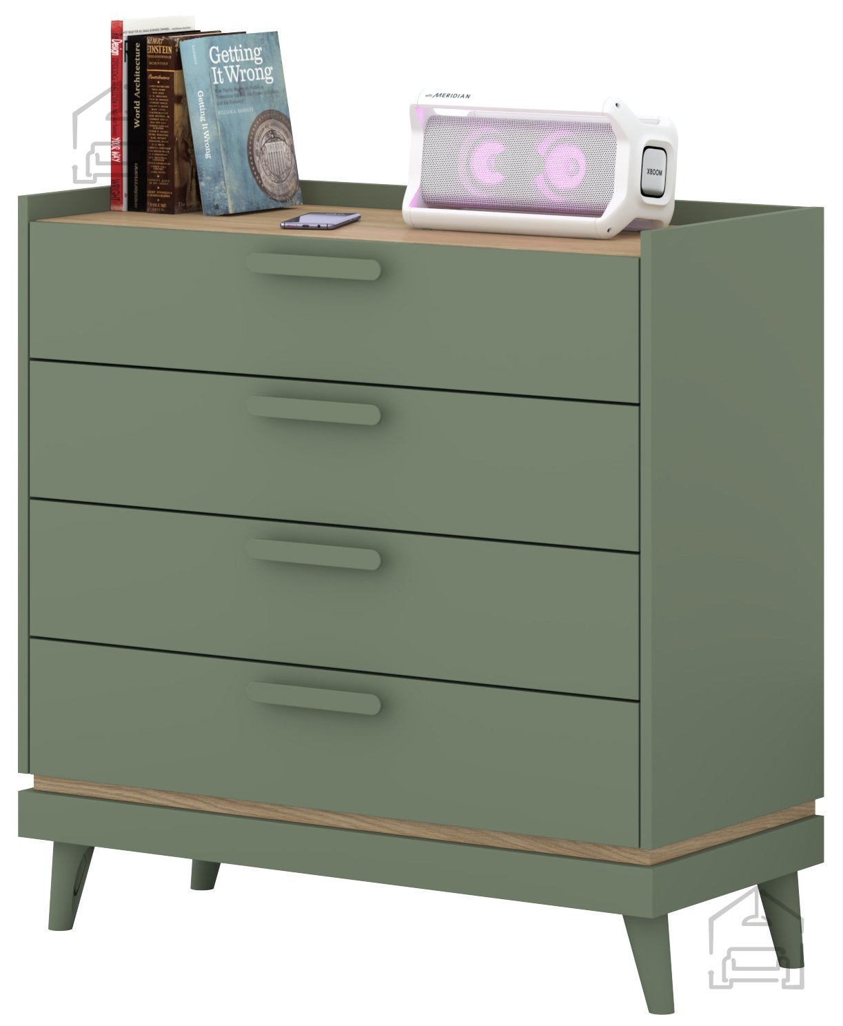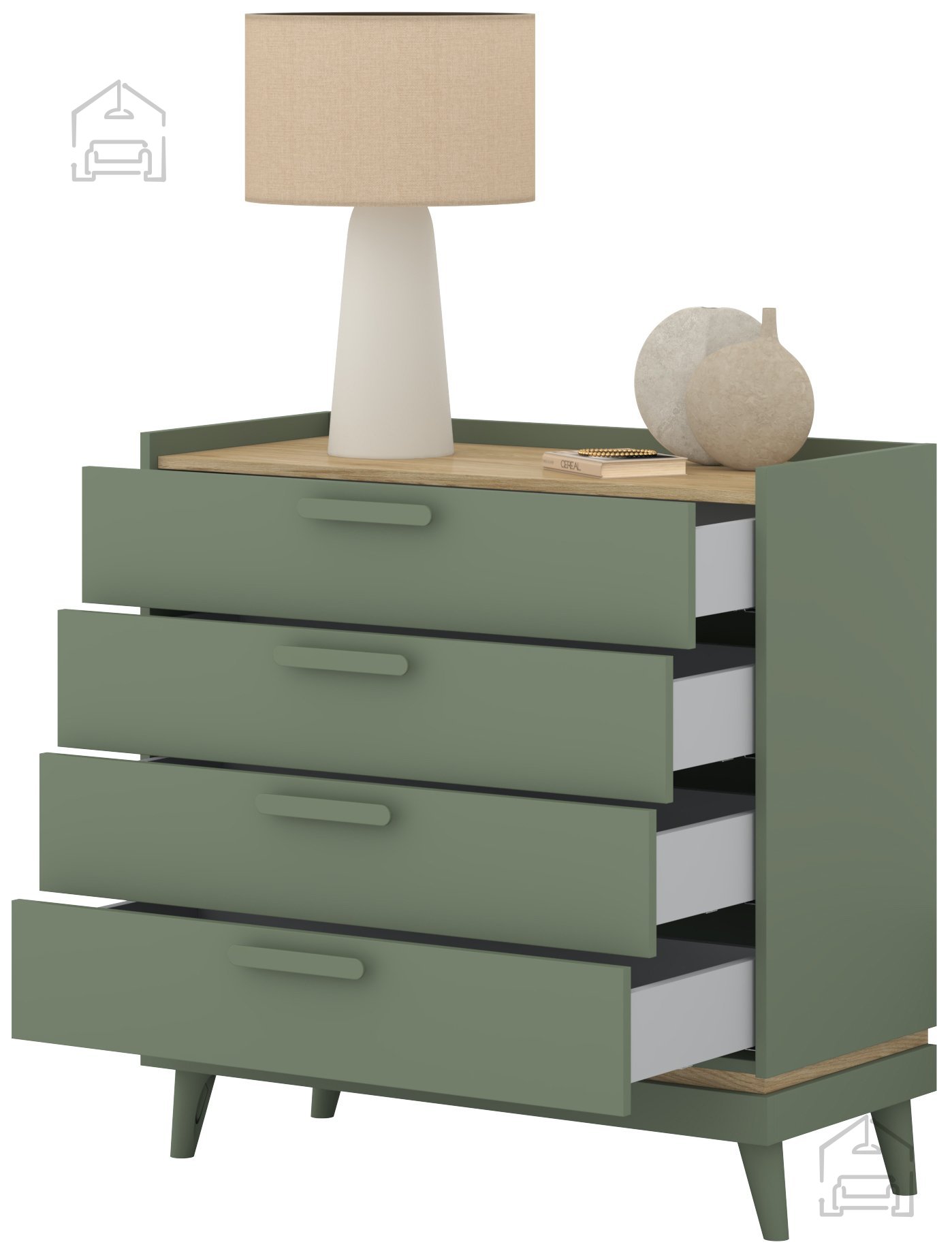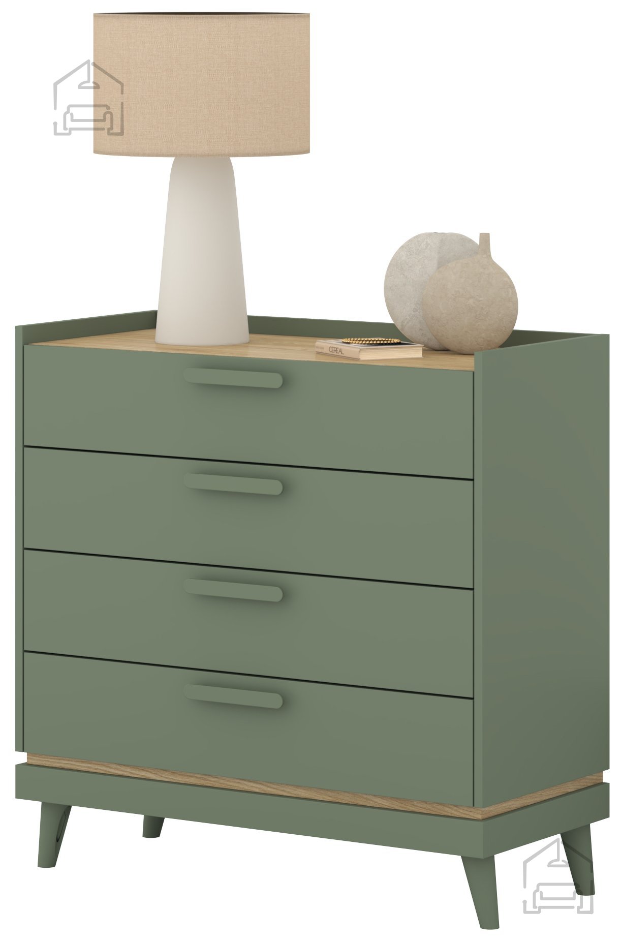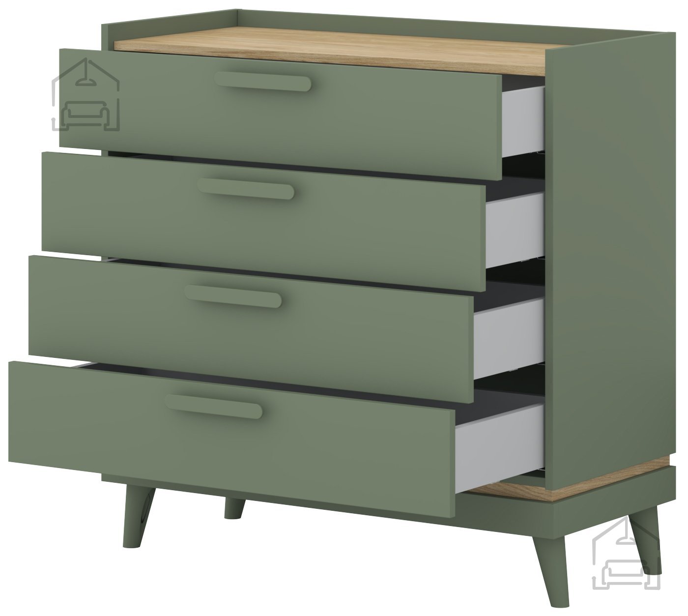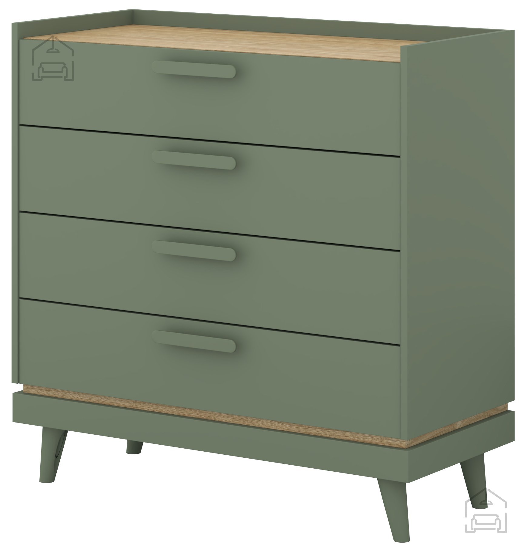Das besondere Merkmal dieser Kommode ist ihre Farbgestaltung – das sanfte verblasste Grün vermittelt Frische und eine natürliche Atmosphäre, während die warmen Eichentöne für Behaglichkeit und Wärme sorgen. Diese Kombination lässt sich mühelos in verschiedene Einrichtungsstile integrieren – vom modernen Minimalismus bis hin zu rustikalen oder Vintage-Interieurs.