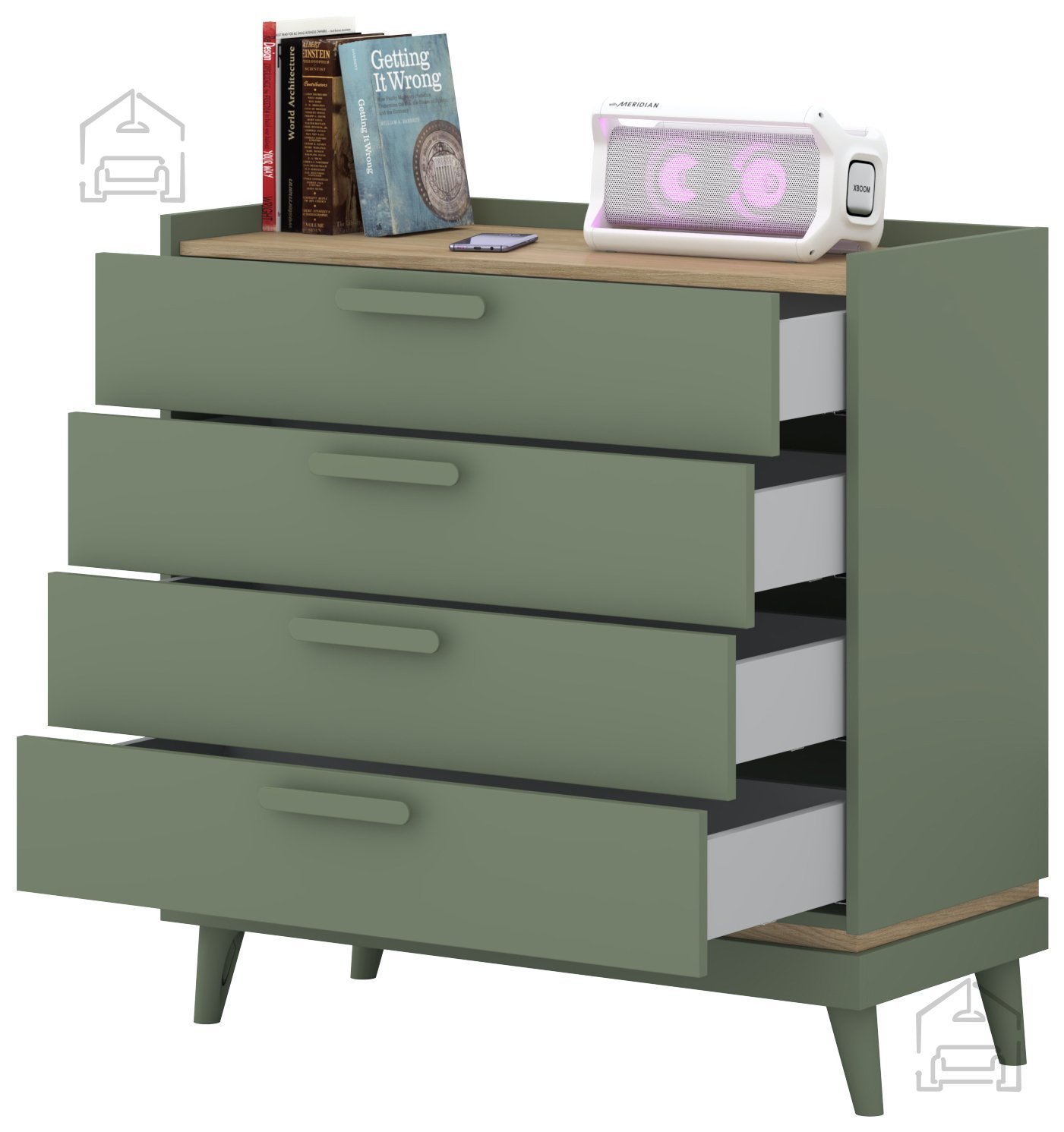 Die Kommode mit den Maßen 90x40x90 cm ist die ideale Wahl für das Wohnzimmer, Schlafzimmer, den Vorraum oder sogar das Homeoffice. Dank ihrer ausgewogenen Größe passt sie sowohl in kleinere als auch in größere Räume. Der geräumige Innenbereich mit vier Laden bietet übersichtlichen Stauraum für Kleidung, Dokumente, Accessoires oder andere persönliche Dinge, die Sie gerne griffbereit, aber dennoch ordentlich verstaut haben möchten.