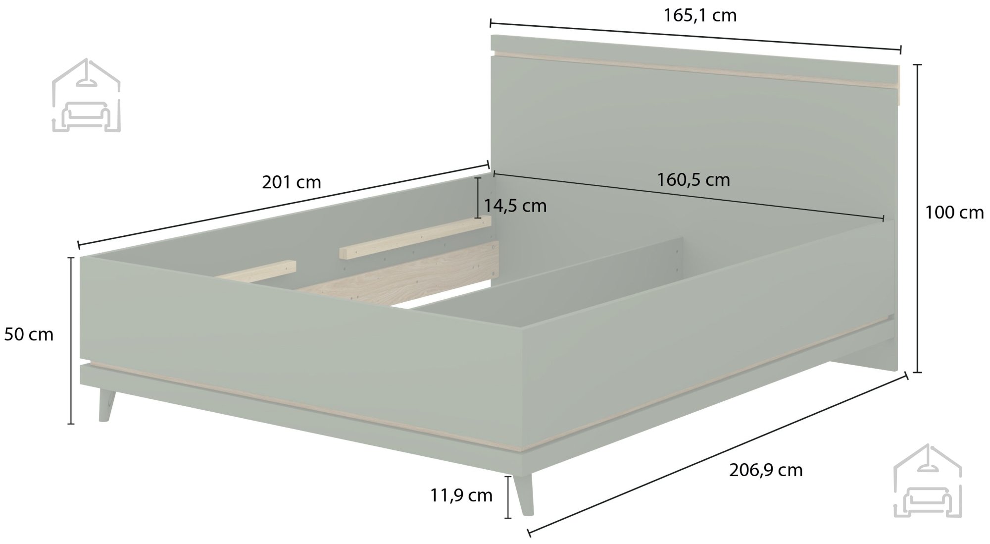 Das Bett besteht aus Möbelplatten mit einer Stärke von 15 mm und 22 mm, was Stabilität und Zuverlässigkeit gewährleistet. ABS-Kanten schützen zusätzlich vor Stößen und Abnutzung, sodass das Bett auch nach Jahren seinen ursprünglichen Look behält. Die dezenten Kunststofffüße verleihen dem Möbelstück eine leichte, moderne Note. Der Mix aus blassgrün geölter Eiche und sanften Grüntönen schafft eine ruhige, natürliche Atmosphäre – typisch für den skandinavischen Stil.