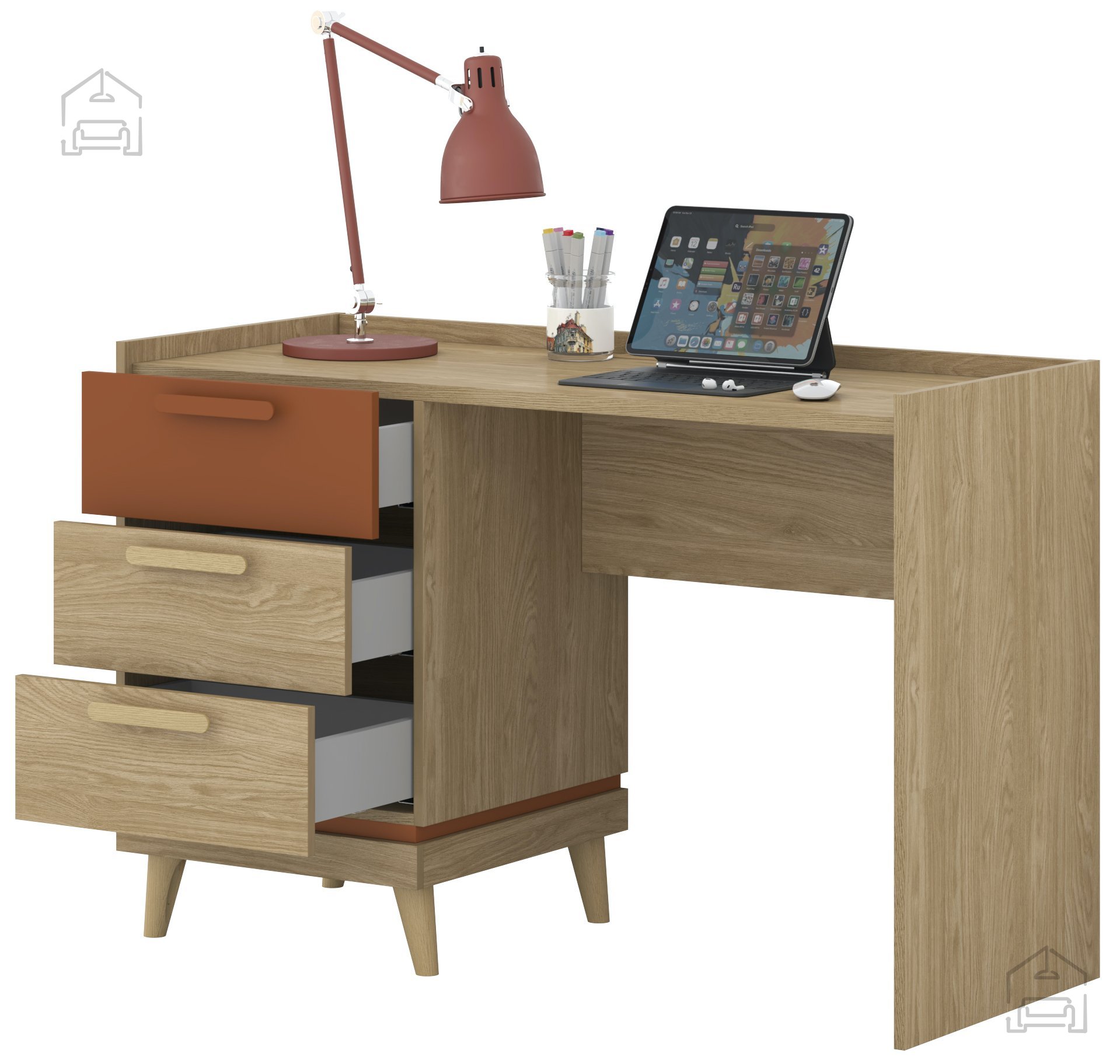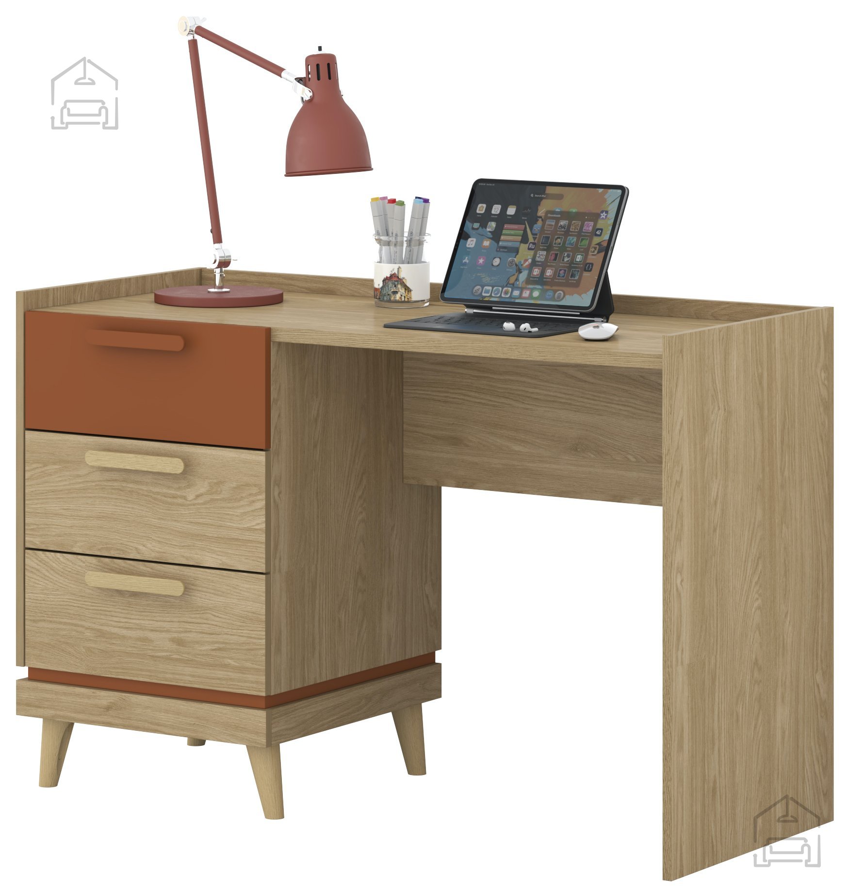 Wenn Sie ein angenehmes und gut organisiertes Arbeitsumfeld schaffen möchten, in dem Sie sich gerne aufhalten, ist dieser Tisch die ideale Wahl. Der natürliche Eichenton wirkt beruhigend, während der Ziegelakzent einen Hauch moderner Frische bringt. Mit seiner Materialqualität, der durchdachten Gestaltung und der schlichten Eleganz ist dieser Tisch eine Investition, die sich langfristig bezahlt macht.