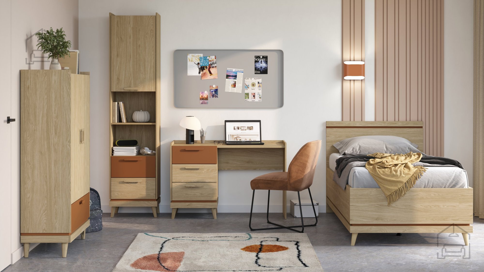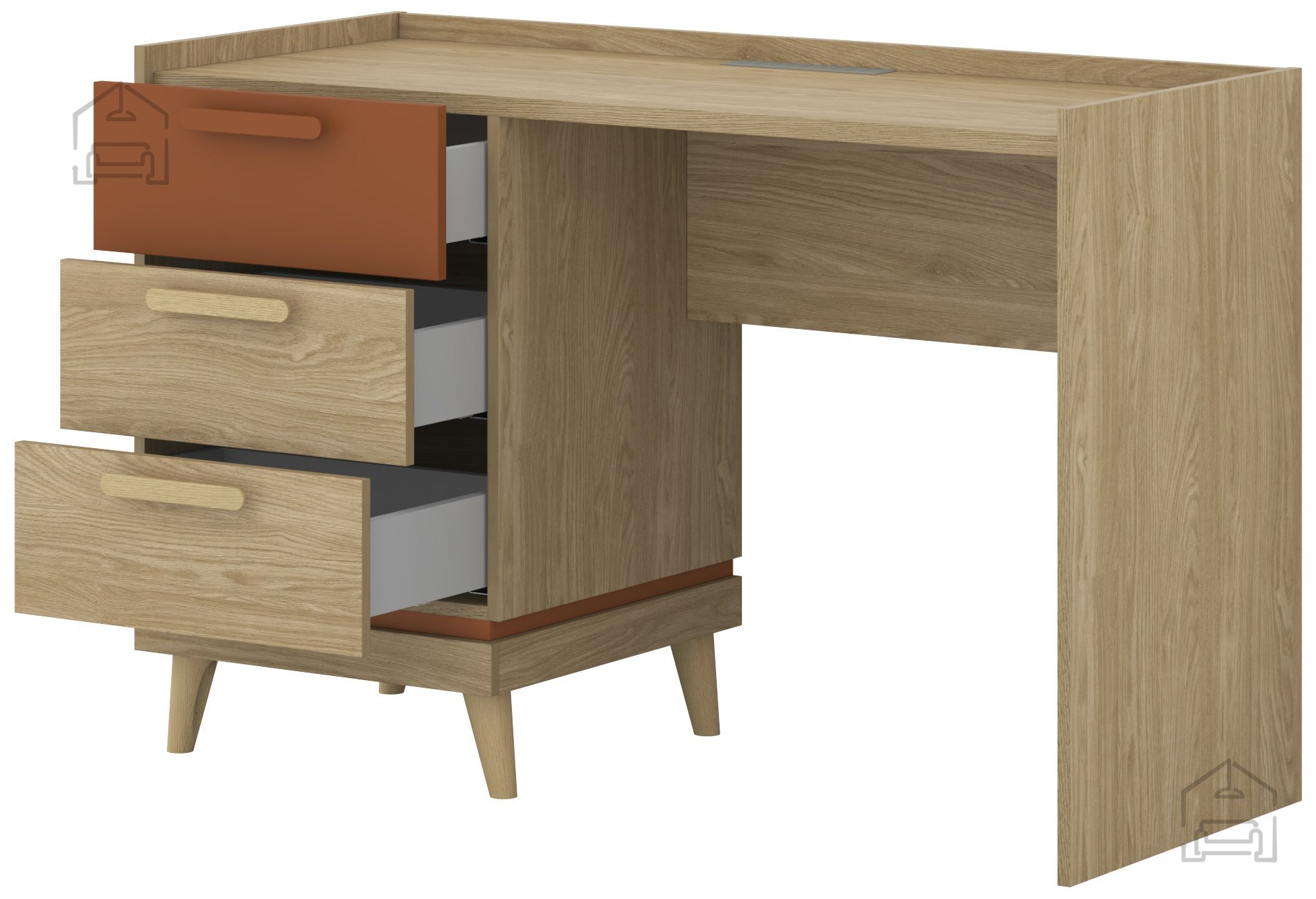 Der Schreibtisch Scandi in der Kombination aus geölter Eiche und Ziegelton ist die perfekte Wahl für alle, die einen klaren, natürlichen und modernen Einrichtungsstil schätzen. Dank der harmonischen Verbindung warmer Holznuancen mit einer minimalistischen Form passt er ideal sowohl ins Homeoffice als auch ins Kinder- oder Jugendzimmer. Durch seine kompakte Größe von 120x50x80 cm lässt er sich auch in kleineren Räumen mühelos aufstellen – ohne auf Komfort oder Funktionalität zu verzichten.