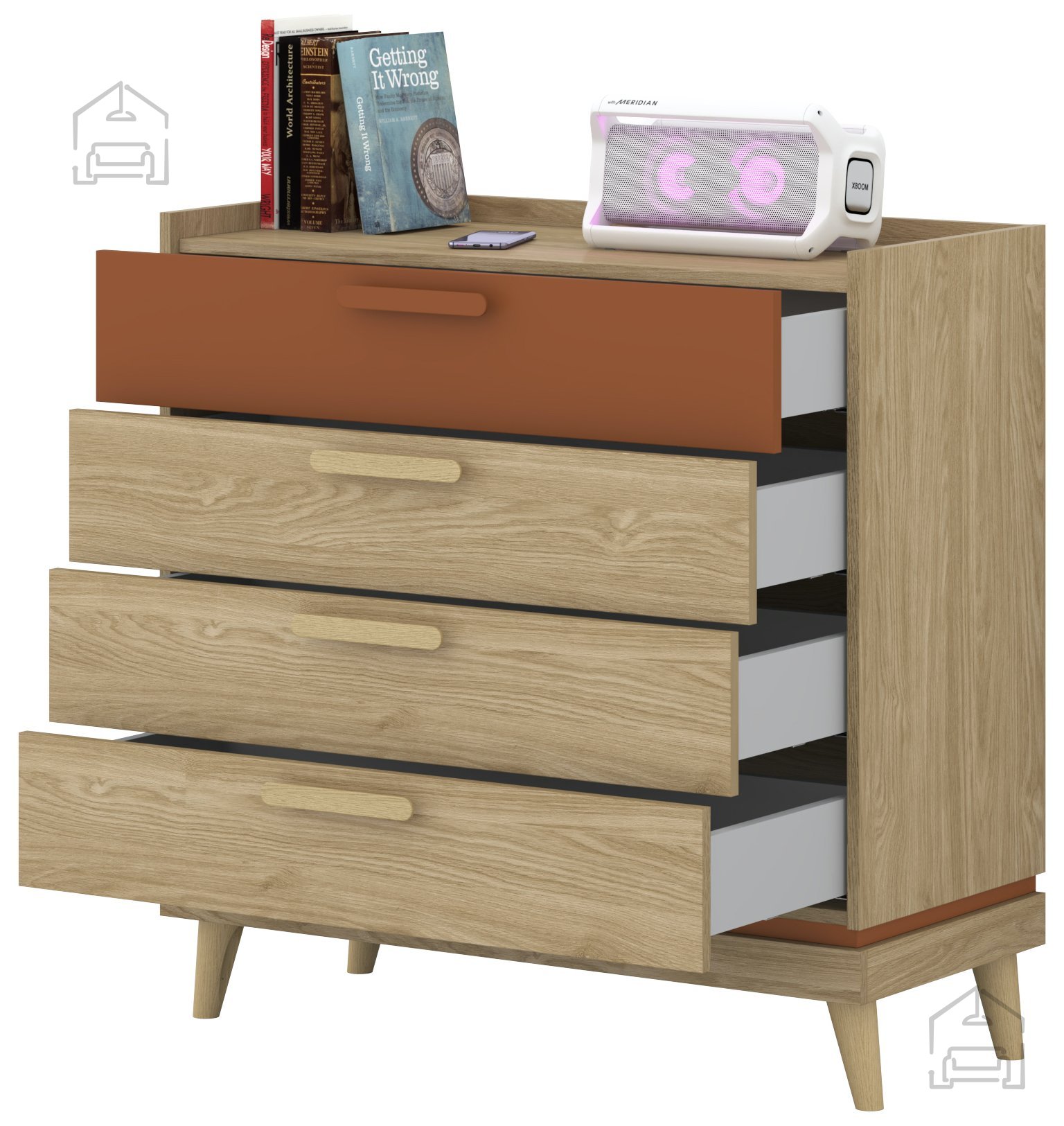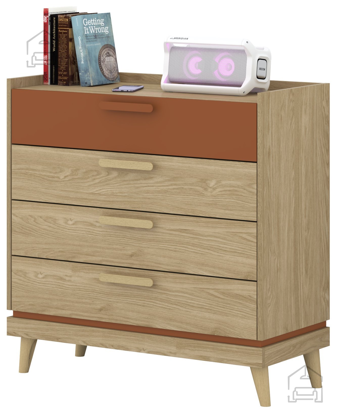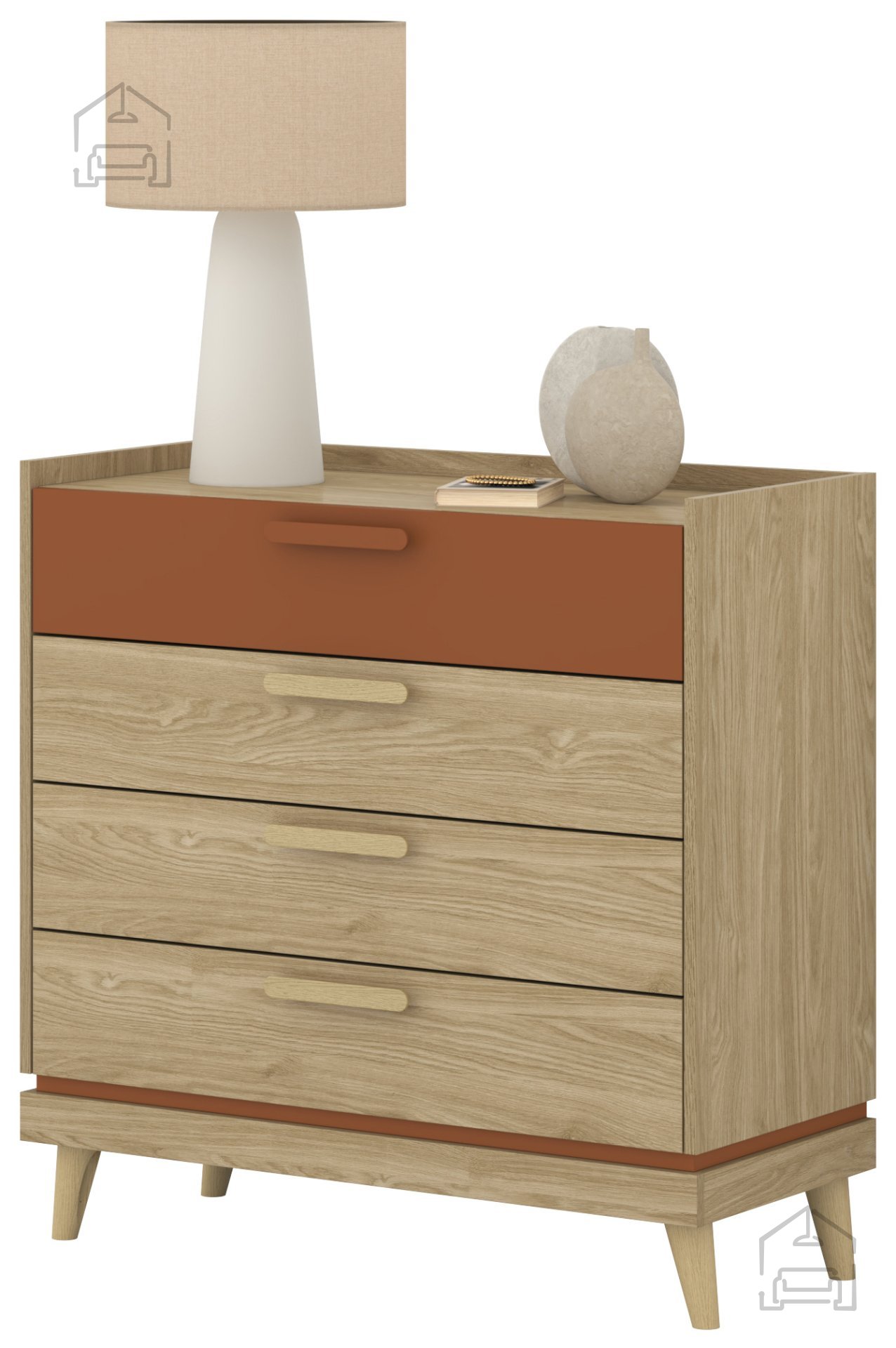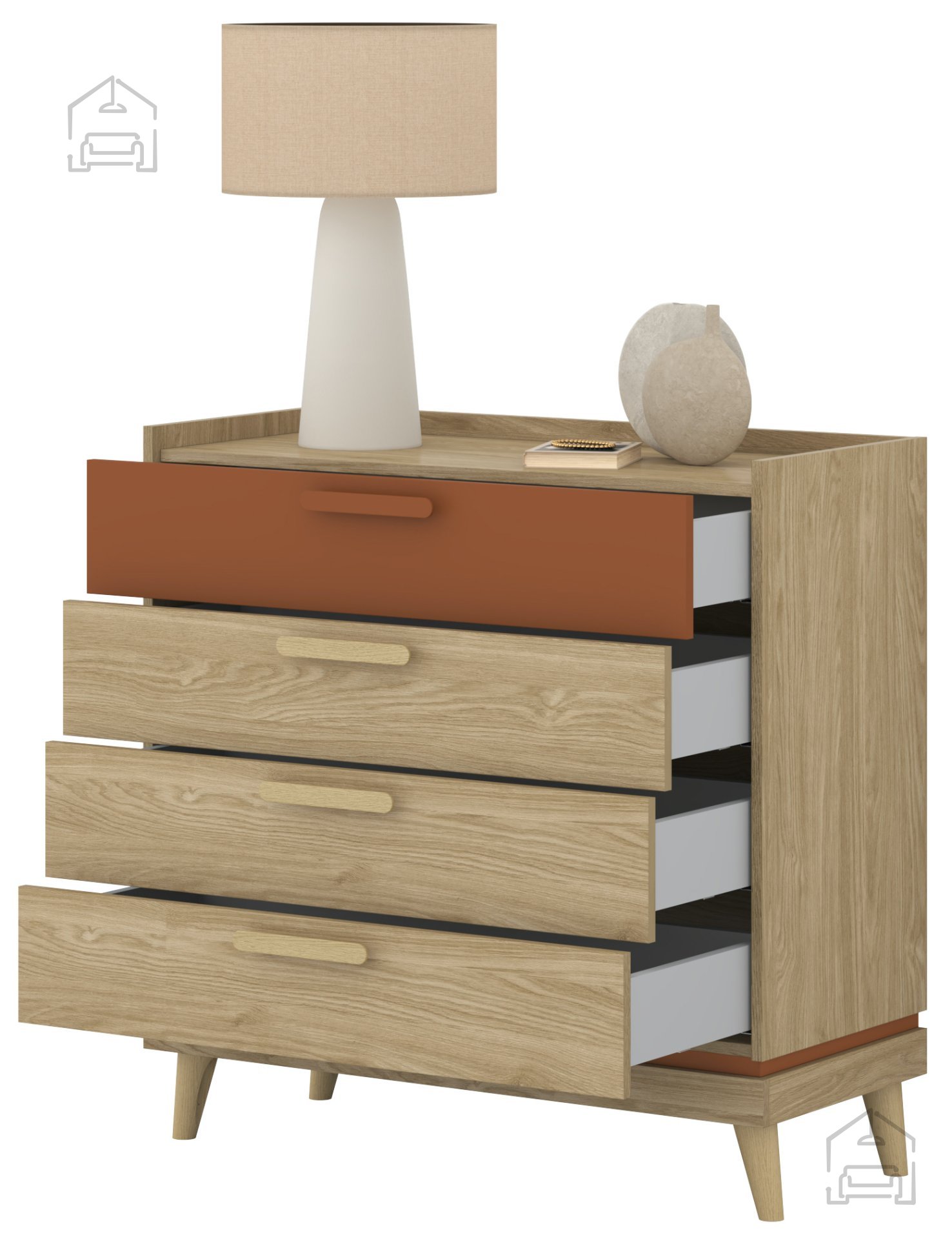 Der warme Eichenlook in Kombination mit dem eleganten Ziegelton schafft ein Gefühl von Behaglichkeit und Geborgenheit. Diese Farbgestaltung harmoniert wunderbar mit neutralen Wandfarben, Möbeln und Textilien und lässt sich daher mühelos in Ihr bestehendes Wohnkonzept integrieren. Mit ein paar dekorativen Akzenten – etwa einer Keramikvase, einer Kerze oder einem gerahmten Foto – verleihen Sie der Kommode Ihre persönliche Note.
