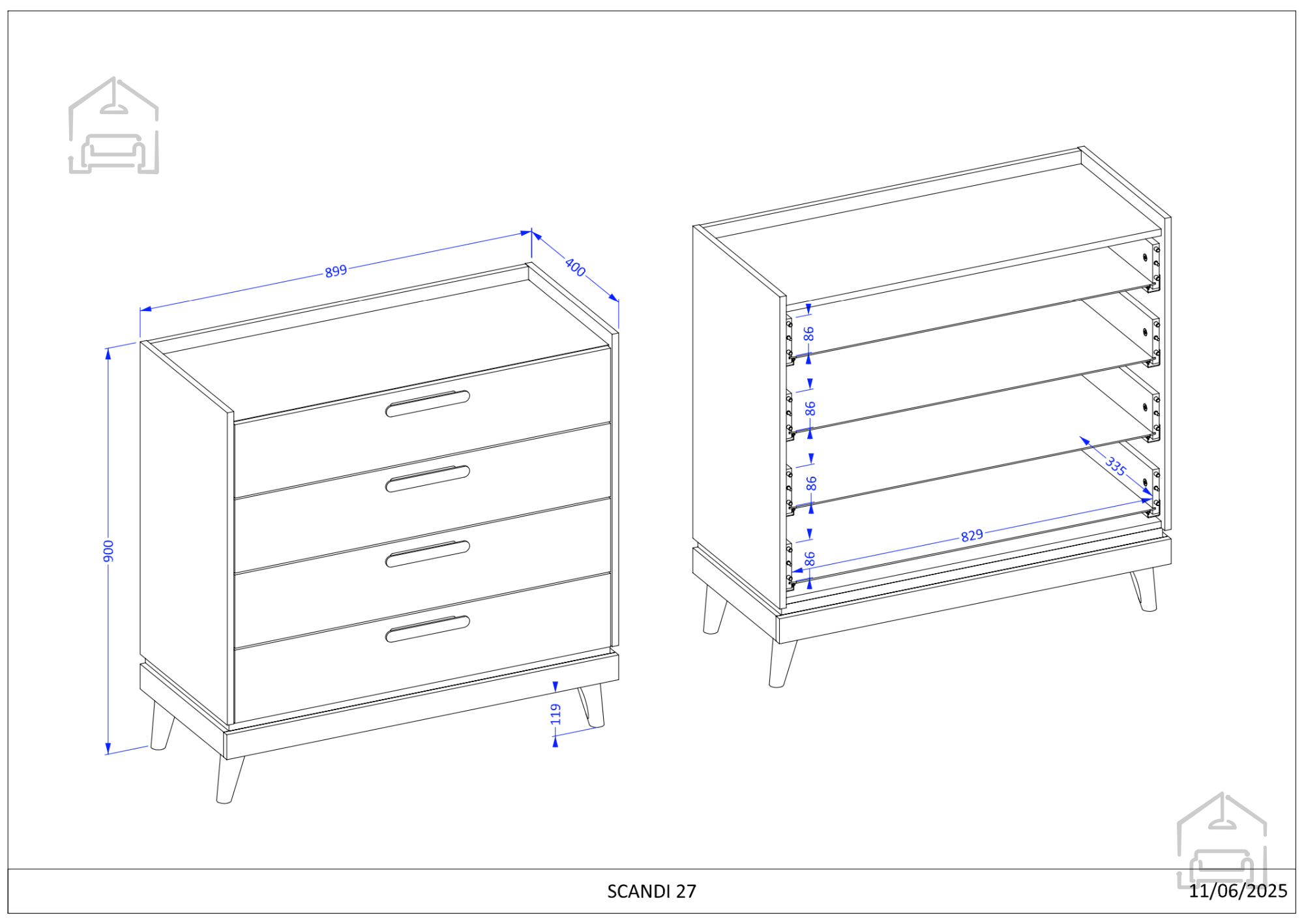 Gefertigt ist sie aus hochwertiger Möbelplatte mit einer Stärke von 15 mm und 22 mm, was Stabilität und Langlebigkeit garantiert. ABS-Kanten schützen zusätzlich vor Stößen und Abnutzung, sodass die Kommode lange ihren makellosen Look behält. Kunststofffüße sorgen für festen Stand, erleichtern das Verschieben und schützen den Boden vor Kratzern.