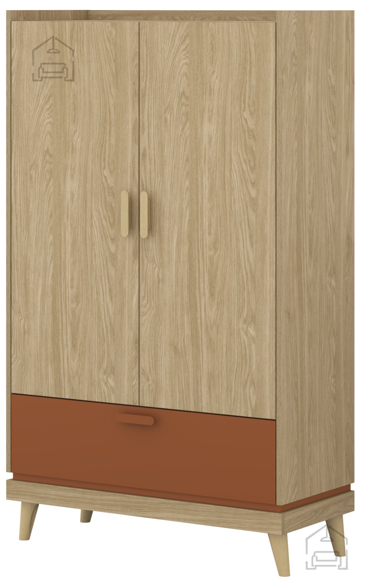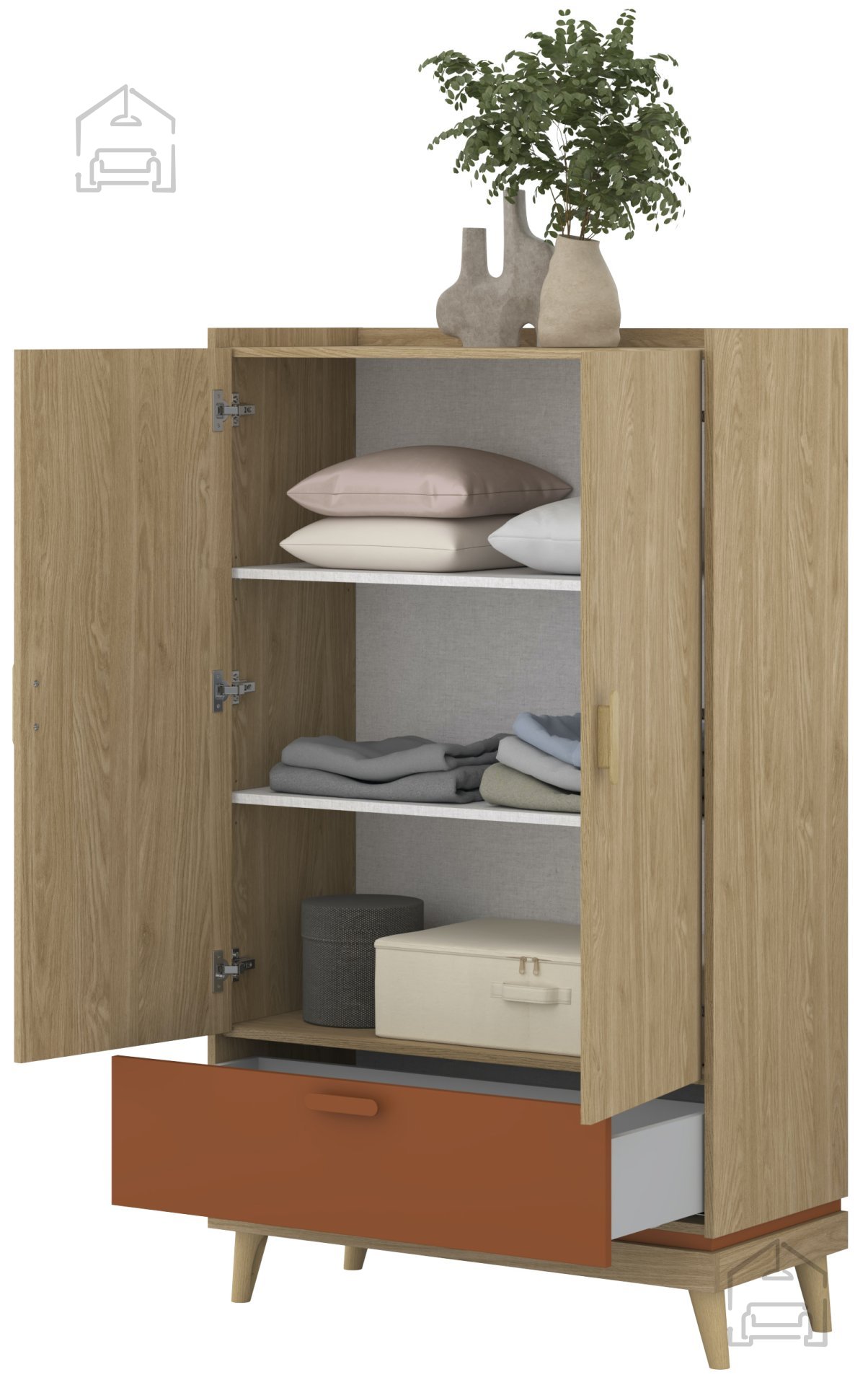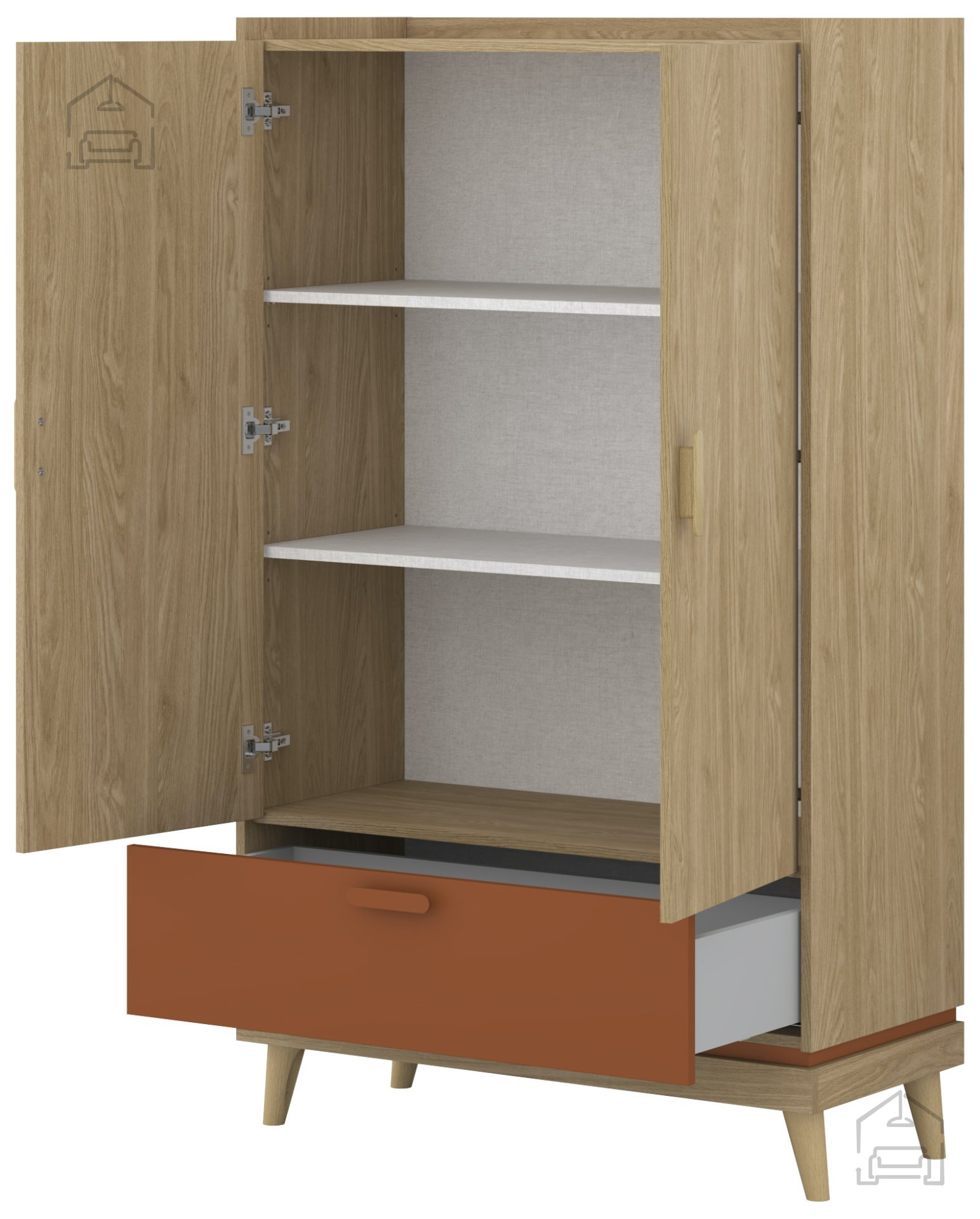 Inspiriert vom skandinavischen Stil bringt dieser Schrank ein Gefühl von Helligkeit, Wärme und Natürlichkeit in Ihr Zuhause. Die Kombination aus geölter Eiche und dem sanften Farbton Ziegelrot schafft einen harmonischen Kontrast, der moderne, rustikale oder klassische Einrichtungen wunderbar ergänzt. Die Möbelplatten mit einer Stärke von 15 mm und 22 mm sind geölt, wodurch die natürliche Holzstruktur betont und gleichzeitig ein zusätzlicher Schutz vor alltäglicher Beanspruchung gewährleistet wird. Die Kanten sind mit ABS-Bändern versehen, was die Robustheit erhöht und die Lebensdauer des Möbelstücks verlängert.