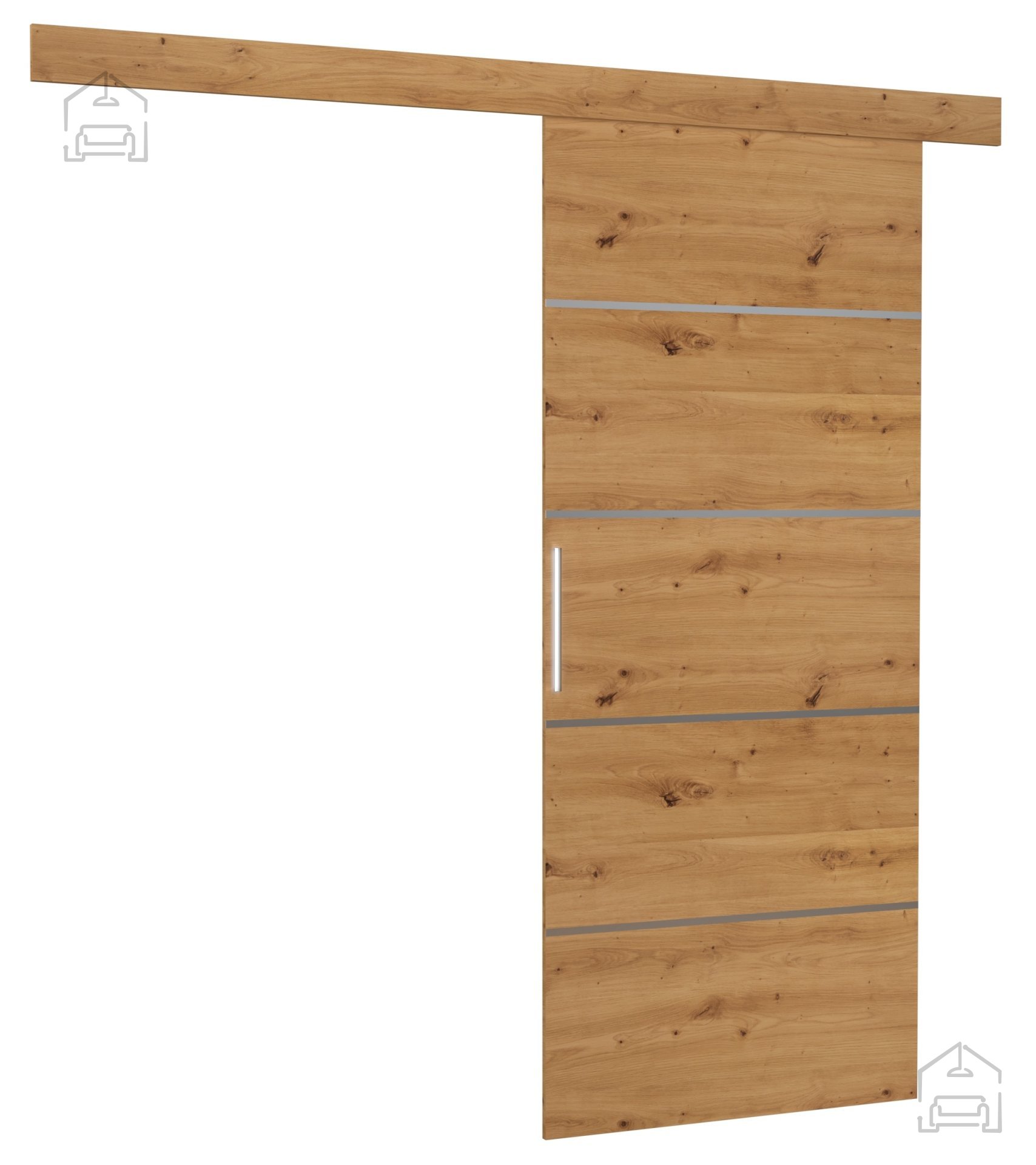 Die Tür Tony 86 besteht aus einer hochwertigen Spanplatte mit 16 mm Stärke, die für Stabilität und Langlebigkeit sorgt. Die Oberfläche in Artisan-Eiche ist so gestaltet, dass sie die natürliche Holzstruktur nachbildet, gleichzeitig robust im Alltag und pflegeleicht bleibt. Im Set sind Schienen enthalten, die eine einfache Montage und ein zuverlässiges Gleiten der Tür ermöglichen. Der Aluminiumgriff mit einem Durchmesser von 28 mm verleiht dem Design einen modernen Akzent und sorgt für angenehme Handhabung.