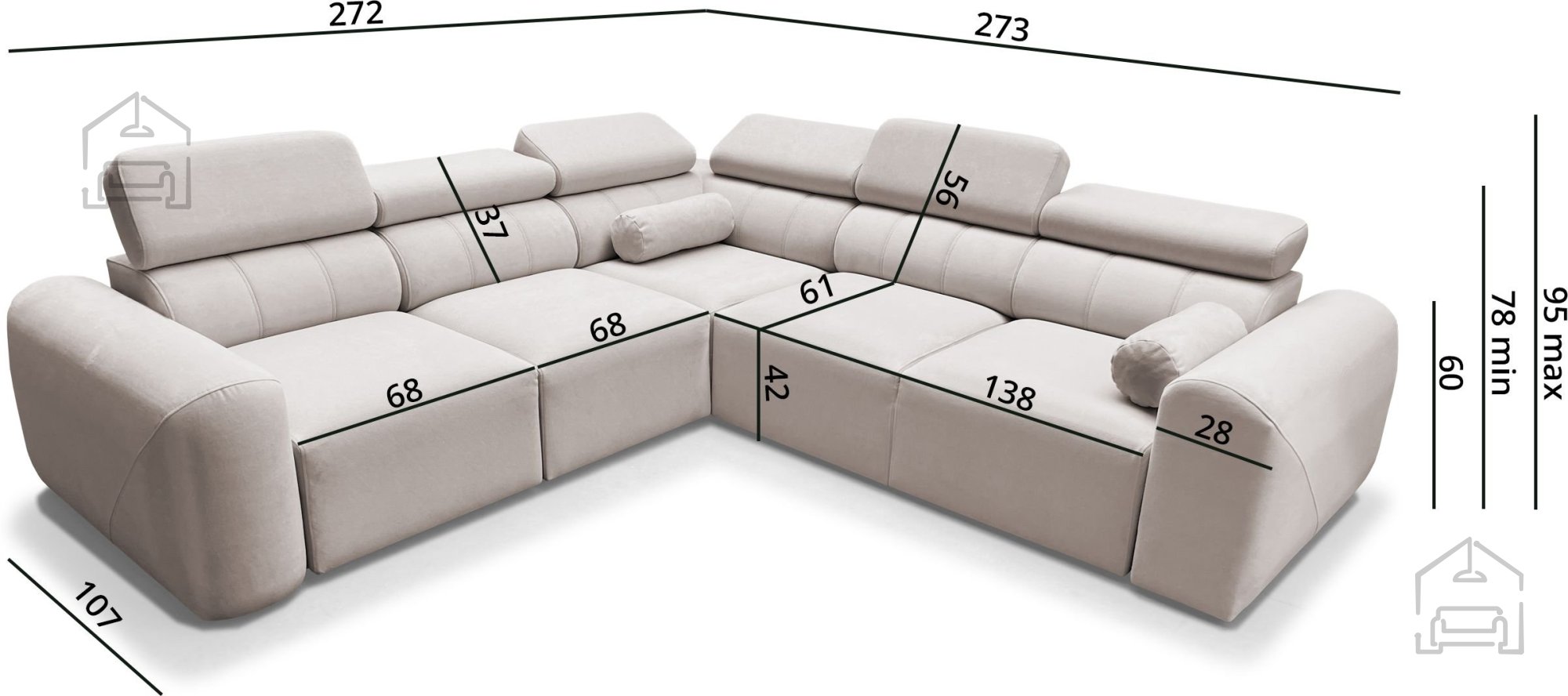 Die Volare III ist so konzipiert, dass sie sich dem Raum ideal anpasst. Bei der Bestellung ist anzugeben, ob Sie die linke oder rechte Eckvariante wünschen; die Seite wird dabei aus Sicht einer Person bestimmt, die vor der Garnitur steht. Diese Flexibilität ermöglicht eine optimale Raumnutzung in jedem Zuhause.