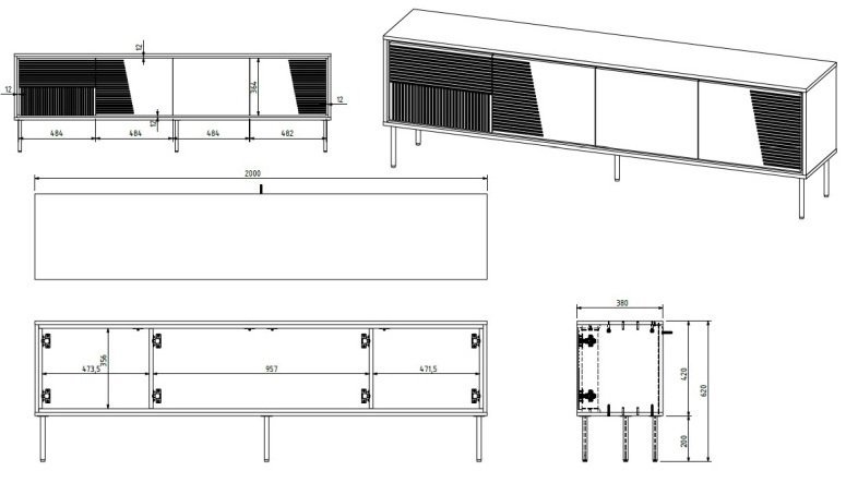 Die Kommode misst 200x38x62 cm und eignet sich damit sowohl für größere Wohnzimmer als auch für offene Wohnbereiche mit großzügigen Wandflächen. Der Korpus besteht aus laminierter Spanplatte mit 16 mm Stärke, was für Stabilität und Robustheit sorgt. Die Fronten aus 18 mm starkem MDF sind fein verarbeitet und bieten eine glatte Oberfläche in Kaschmir matt und Kaschmir hochglanz. Die Kanten sind mit einem 0,45 mm starken ABS‑Band geschützt, das die Stoß- und Abriebfestigkeit erhöht und die Lebensdauer des Möbels verlängert.