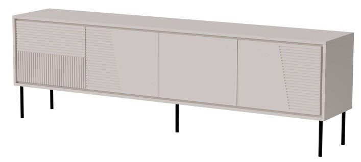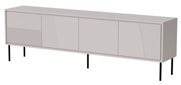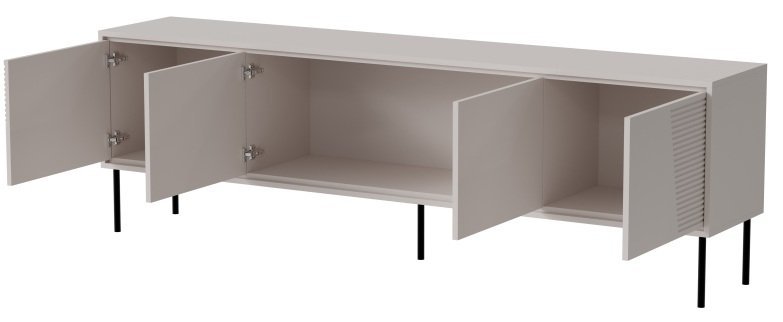 Die TV-Kommode steht auf schwarzen Metallbeinen mit einer Höhe von 20 cm. Diese Konstruktion verleiht dem Möbel ein leichtes Erscheinungsbild, erleichtert das Reinigen unter dem Möbel und sorgt für eine gute Luftzirkulation. Der schwarze Farbton der Beine bildet einen dezenten Kontrast zum warmen Kaschmir-Ton und unterstreicht den modernen Charakter des Designs.