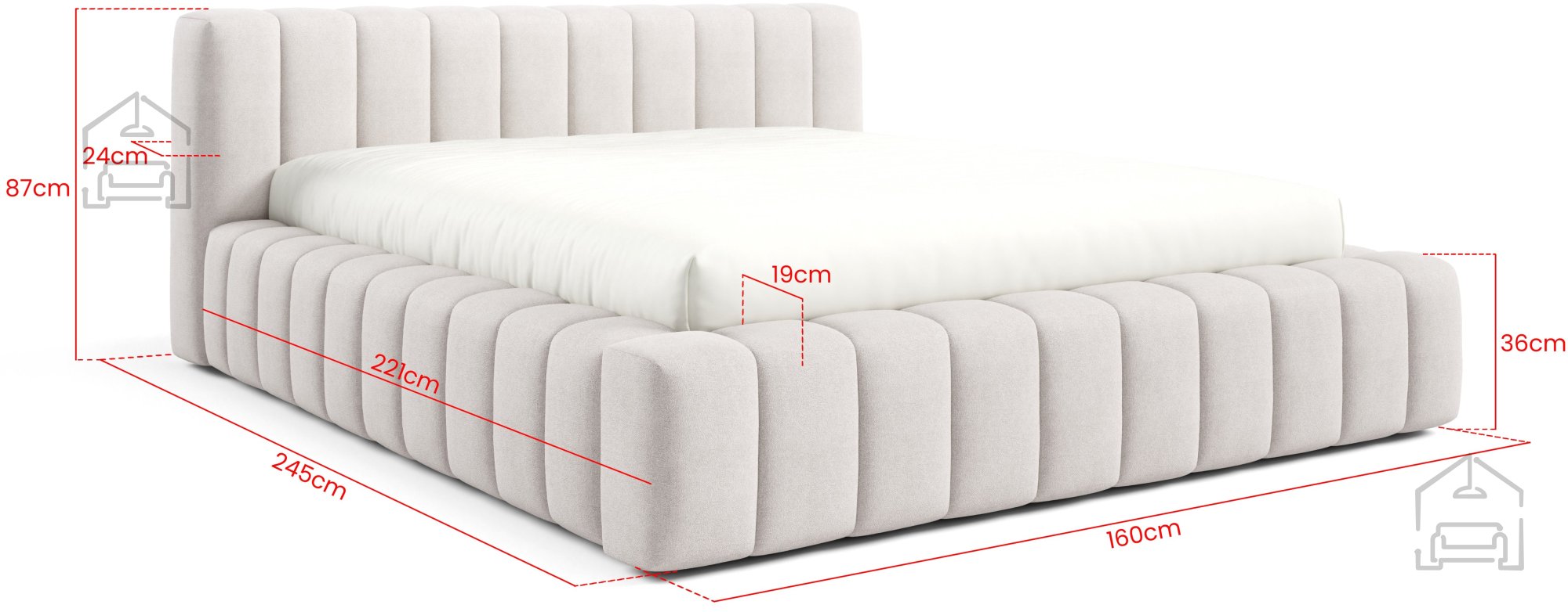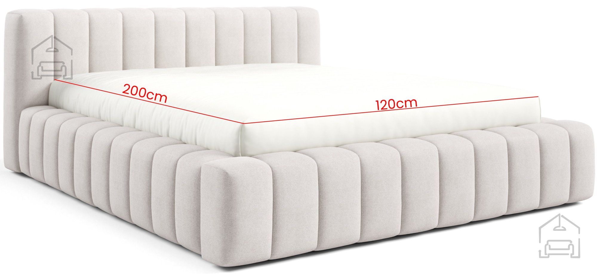 Die Gesamtmaße des Bettes betragen 245x87 cm. Die Höhe des Kopfteils liegt bei 87 cm, die Seitenhöhe bei 36 cm, die Dicke der Seitenwand bei 19 cm, die Kopfteildicke bei 24 cm, und die Höhe der Füße (Gleiter) beträgt 1 cm. Erhältlich ist das Modell in verschiedenen Breiten der Liegefläche: 120 bei einer Länge von 200 cm. Je nach Geschmack kann zwischen unterschiedlichen Stoffarten und Farbkombinationen gewählt werden, um das Bett perfekt an den Stil des Schlafzimmers anzupassen.