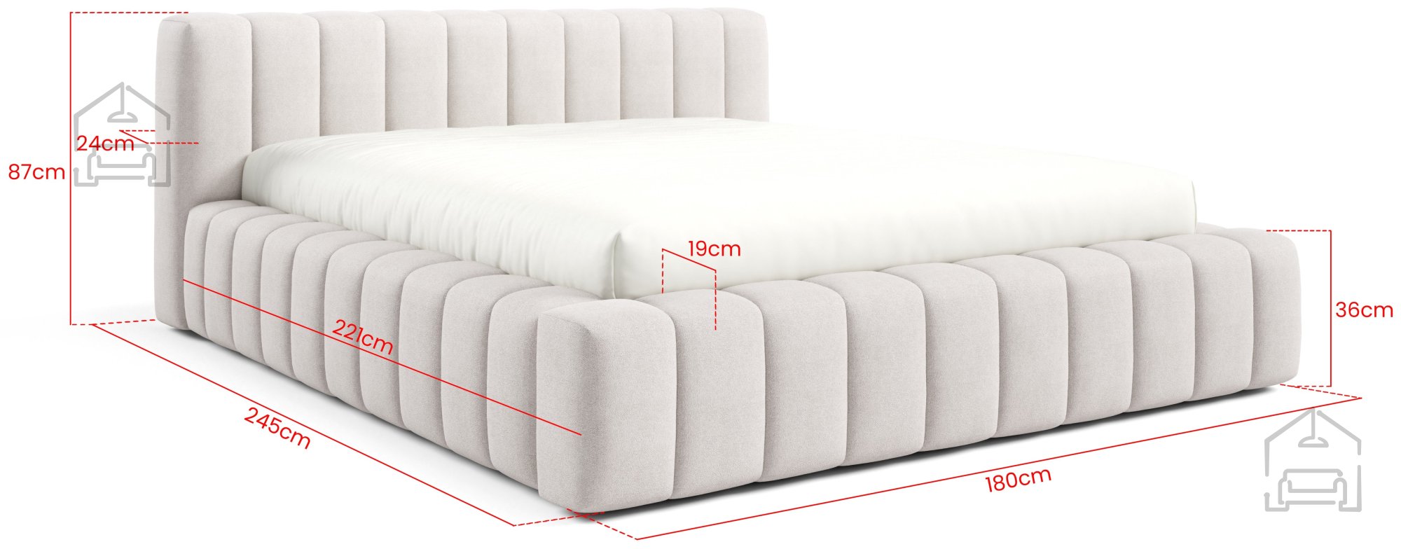 Die Gesamtmaße des Bettes betragen 245x87 cm. Die Höhe des Kopfteils liegt bei 87 cm, die Seitenhöhe bei 36 cm, die Seitendicke bei 19 cm, die Kopfteilstärke bei 24 cm und die Höhe der Gleiter bei 1 cm. Erhältlich ist es mit einer Liegefläche von 140 x 200 cm. Der Kunde kann aus verschiedenen Stoffarten und Farbvarianten wählen, um das Bett perfekt an den Stil des Schlafzimmers anzupassen.