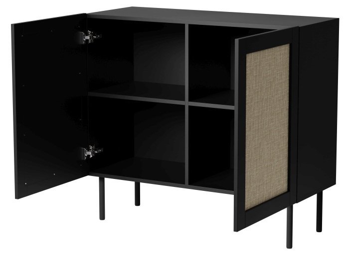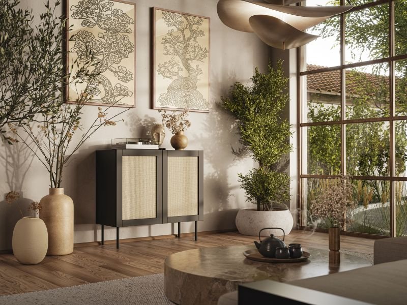 Die schwarze Oberfläche verleiht der Kommode Juta einen eleganten und zeitlosen Look. Diese Farbgestaltung lässt sich mühelos mit anderen Tönen und Materialien kombinieren – von warmen Holzakzenten bis zu kühlen Metallelementen. Schwarz schafft Struktur und optische Tiefe und harmoniert sowohl mit matten als auch mit hochglänzenden Flächen.