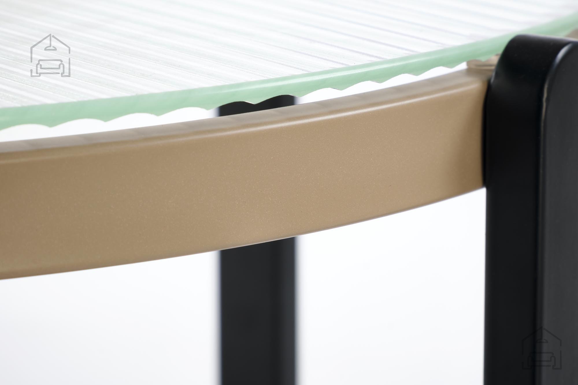 Der Tisch besteht aus einer hochwertigen Materialkombination, die Stabilität und Langlebigkeit garantiert. Die Tischplatte ist aus gehärtetem Glas gefertigt, was für klare Linien sorgt und die Reinigung erleichtert. Das Untergestell besteht aus MDF-Platten mit natürlicher Folienbeschichtung und stahlfarbenen Beinen, die pulverbeschichtet sind. Diese Kombination schafft einen harmonischen Kontrast zwischen der warmen Holzoptik und der kühlen Metalloberfläche.