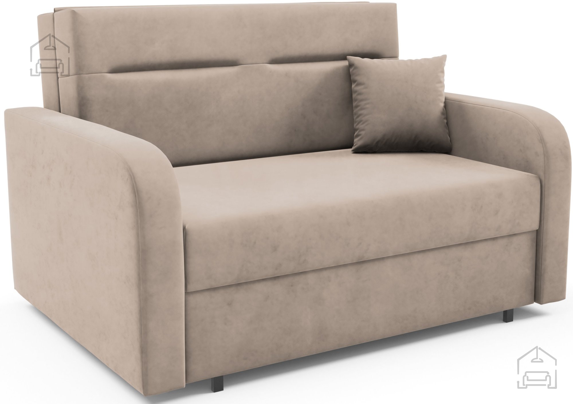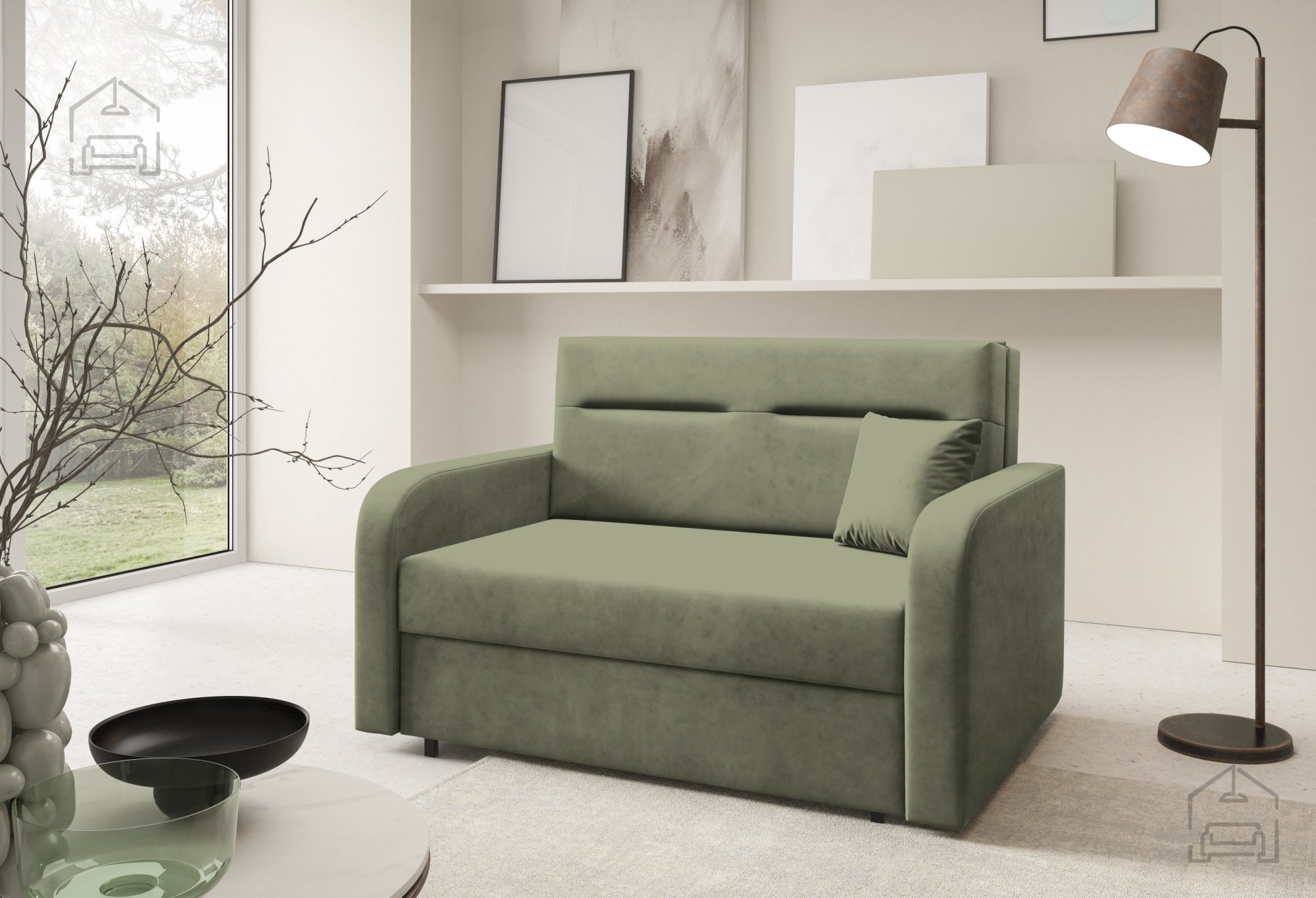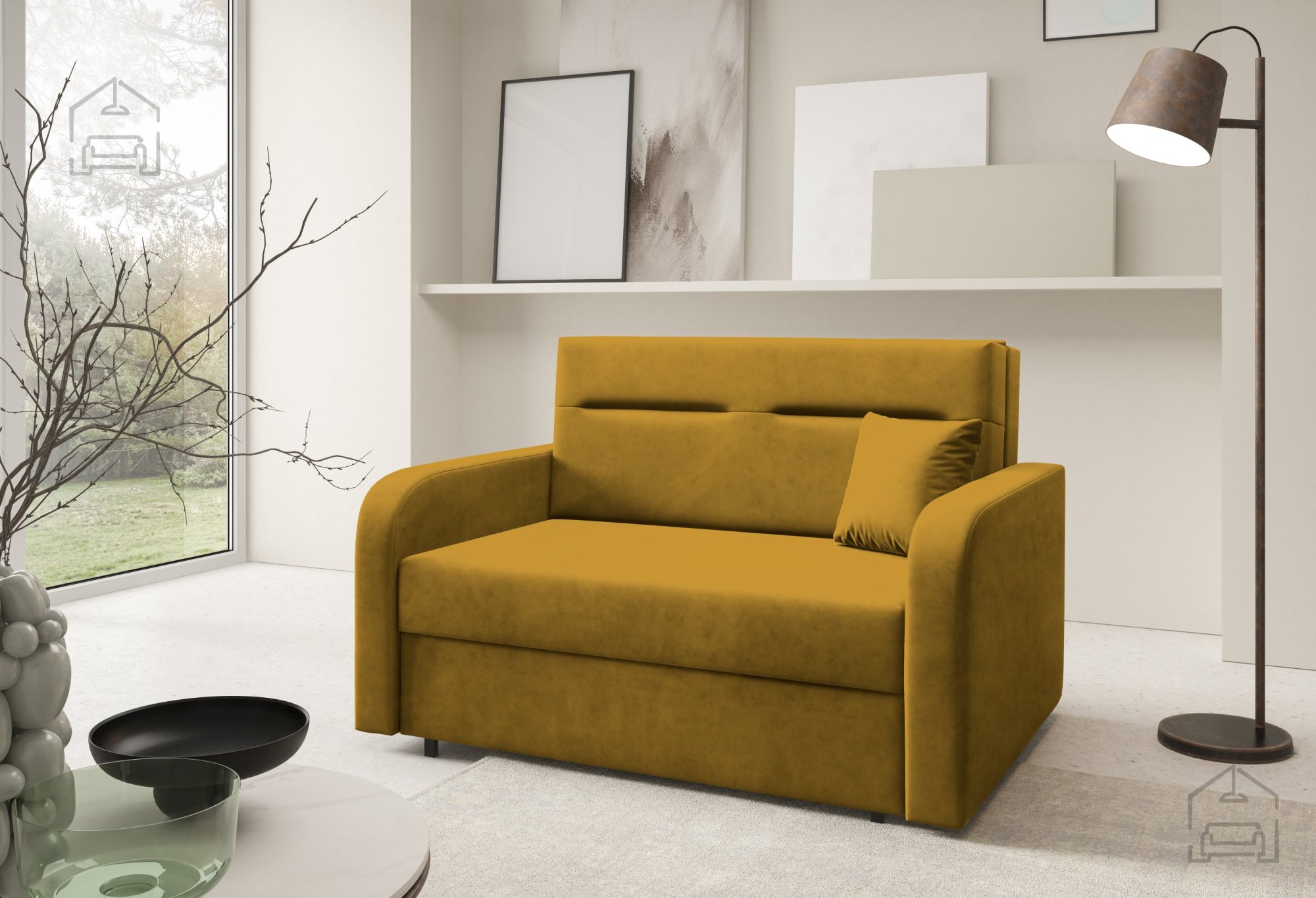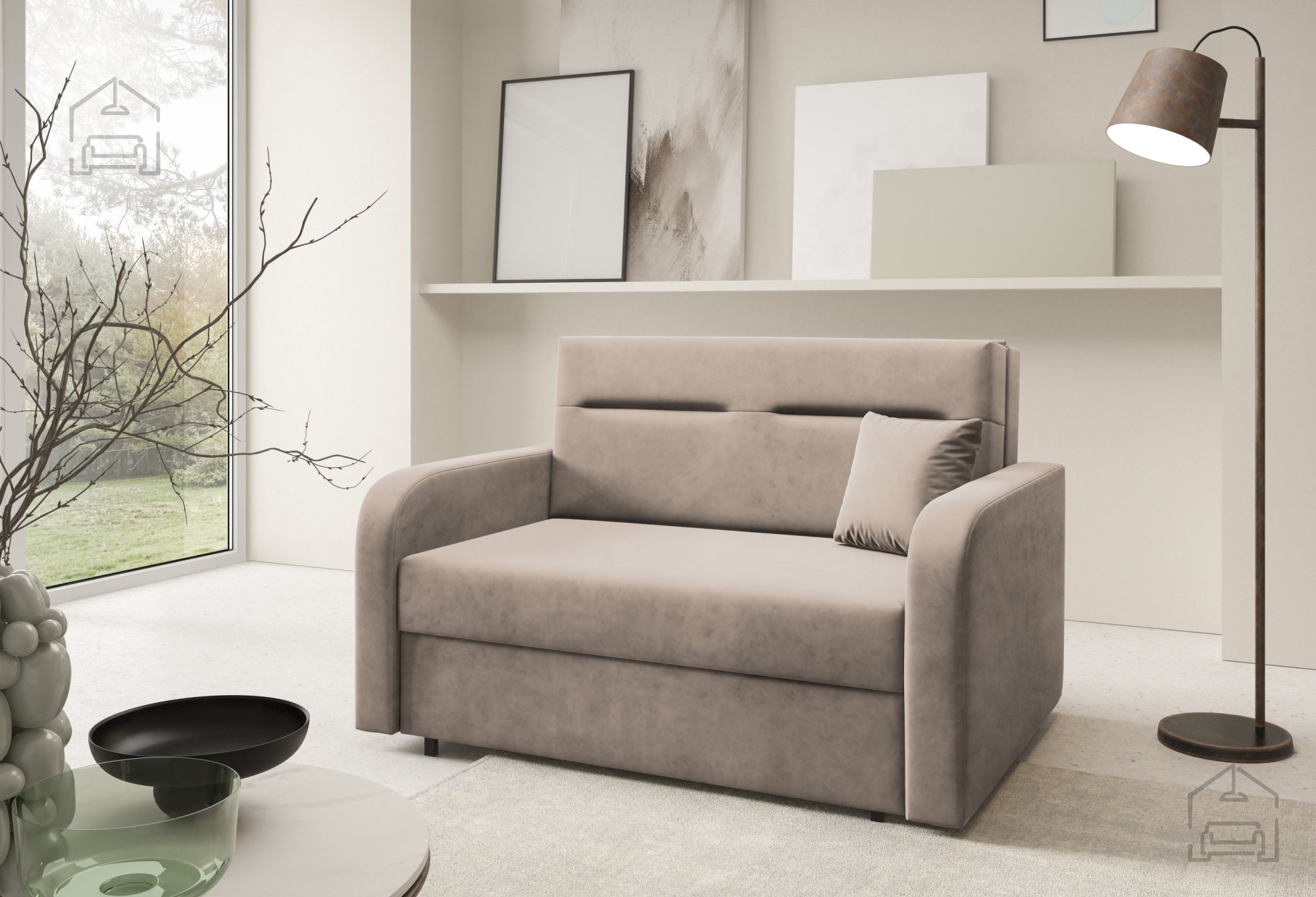 Auf dem Foto ist das Sofa in der Stoffvariante Kronos 14 zu sehen, die mit ihrer samtigen Haptik und dem warmen Erscheinungsbild Gemütlichkeit in den Raum bringt. Das Modell ist in mehreren Farbvarianten erhältlich und lässt sich daher leicht an bestehende Einrichtungen anpassen. Dank seiner kompakten Größe und des schlichten Designs passt es sowohl in Kinder- und Jugendzimmer als auch in kleine Wohnzimmer oder Ferienwohnungen.