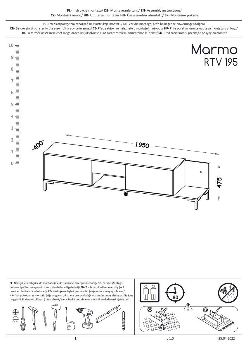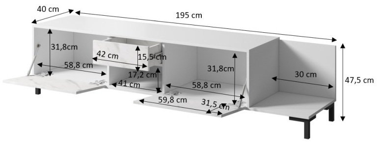 Die TV-Kommode Marmo RTV2D1S1K ist ideal für alle, die ihr Wohnzimmer ordentlich und stilvoll gestalten möchten. Durch ihre Länge eignet sie sich auch für große Fernseher, während die Innenfächer und Schubladen ausreichend Platz für Multimedia-Geräte, Fernbedienungen, Kabel oder Filmsammlungen bieten. Das offene Fach ist praktisch für Geräte, die Luftzirkulation oder direkten Zugriff auf Fernbedienungssignale benötigen.