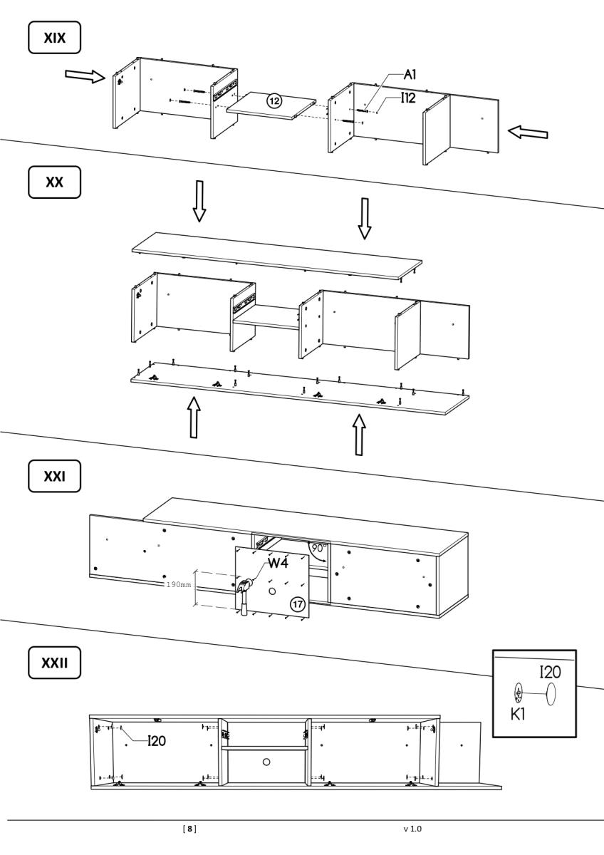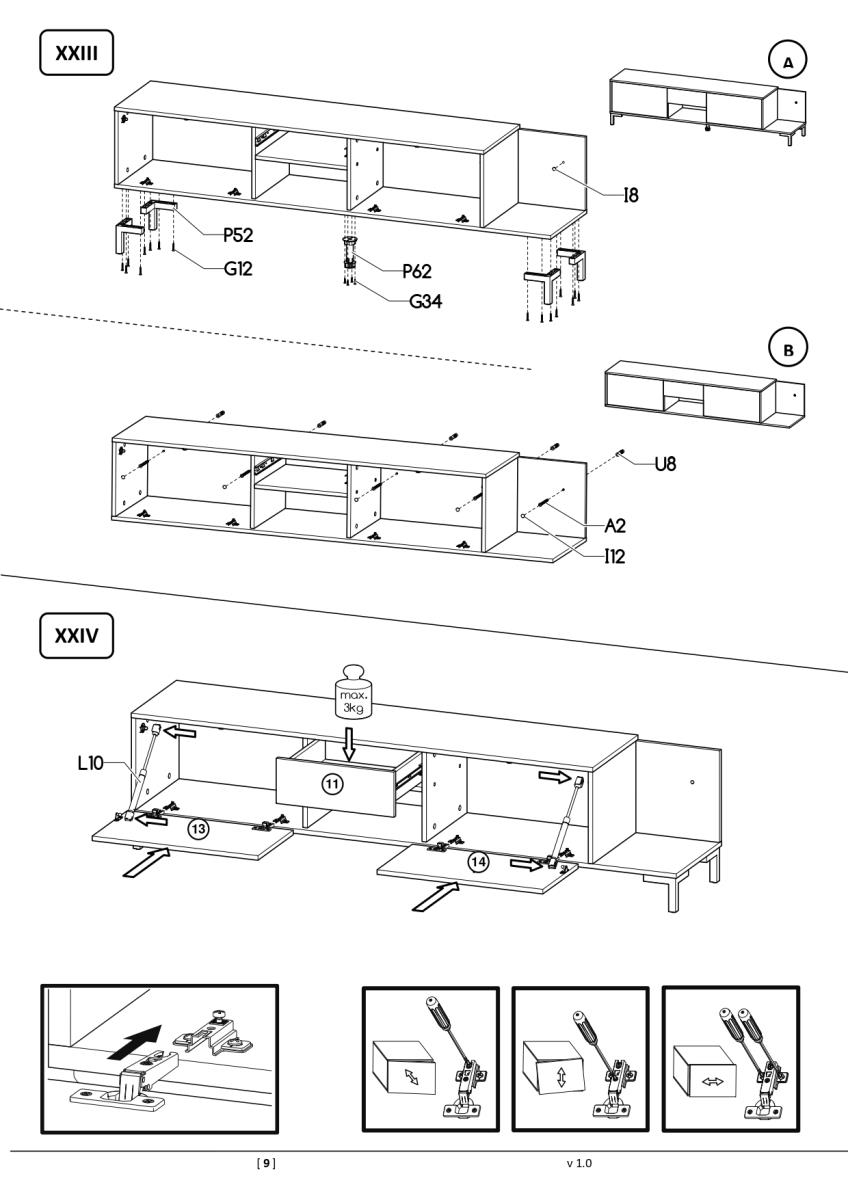 Die Kommode Marmo RTV2D1S1K überzeugt mit einer durchdachten Aufteilung, die Platz für AV-Geräte, Kabel und Zubehör bietet. Die Bezeichnung RTV2D1S1K steht für zwei Türen (2D), eine Schublade (1S) und ein offenes Fach (1K). So bleiben Geräte wie Receiver, Spielkonsolen oder DVD-Player stets griffbereit, während Kabel und Zubehör ordentlich verstaut sind.