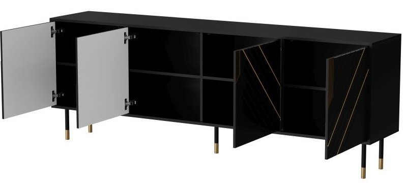 Die Kommode ist in vier Türen (4D) unterteilt und ermöglicht eine übersichtliche Organisation der aufbewahrten Gegenstände. Das Push-to-open-System sorgt für bequemes Öffnen ohne klassische Griffe – ein leichter Druck genügt, und die Türen öffnen sich sanft und leise. Dieser Mechanismus bewahrt die klaren Linien der Front und unterstreicht das moderne Erscheinungsbild. Das Innere bietet ausreichend Platz für Geschirr, Textilien oder Dokumente – je nachdem, in welchem Raum Sie die Kommode verwenden.