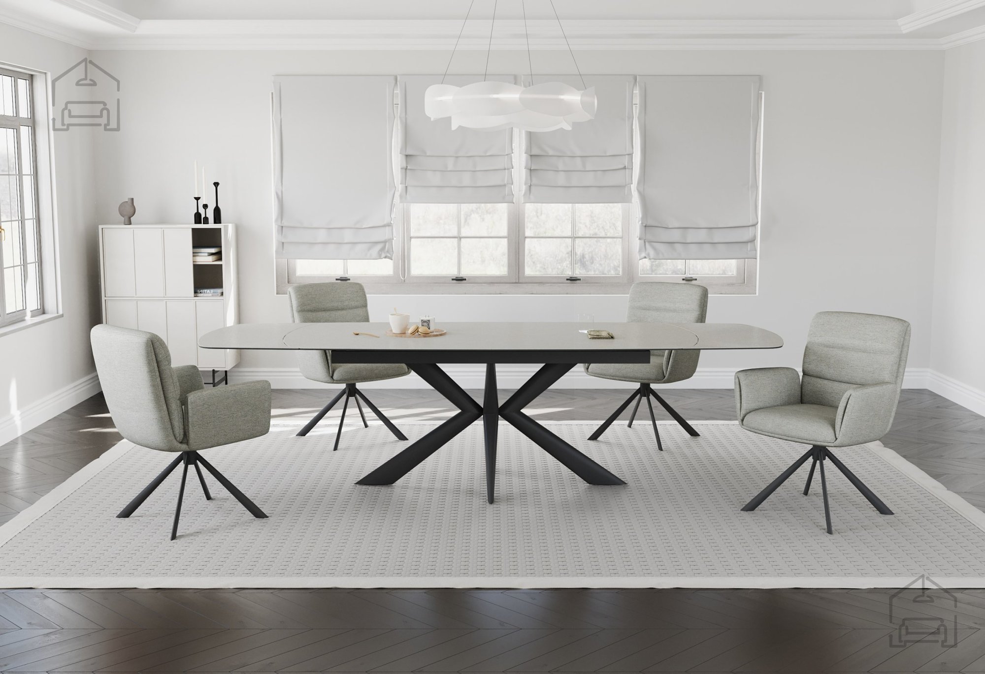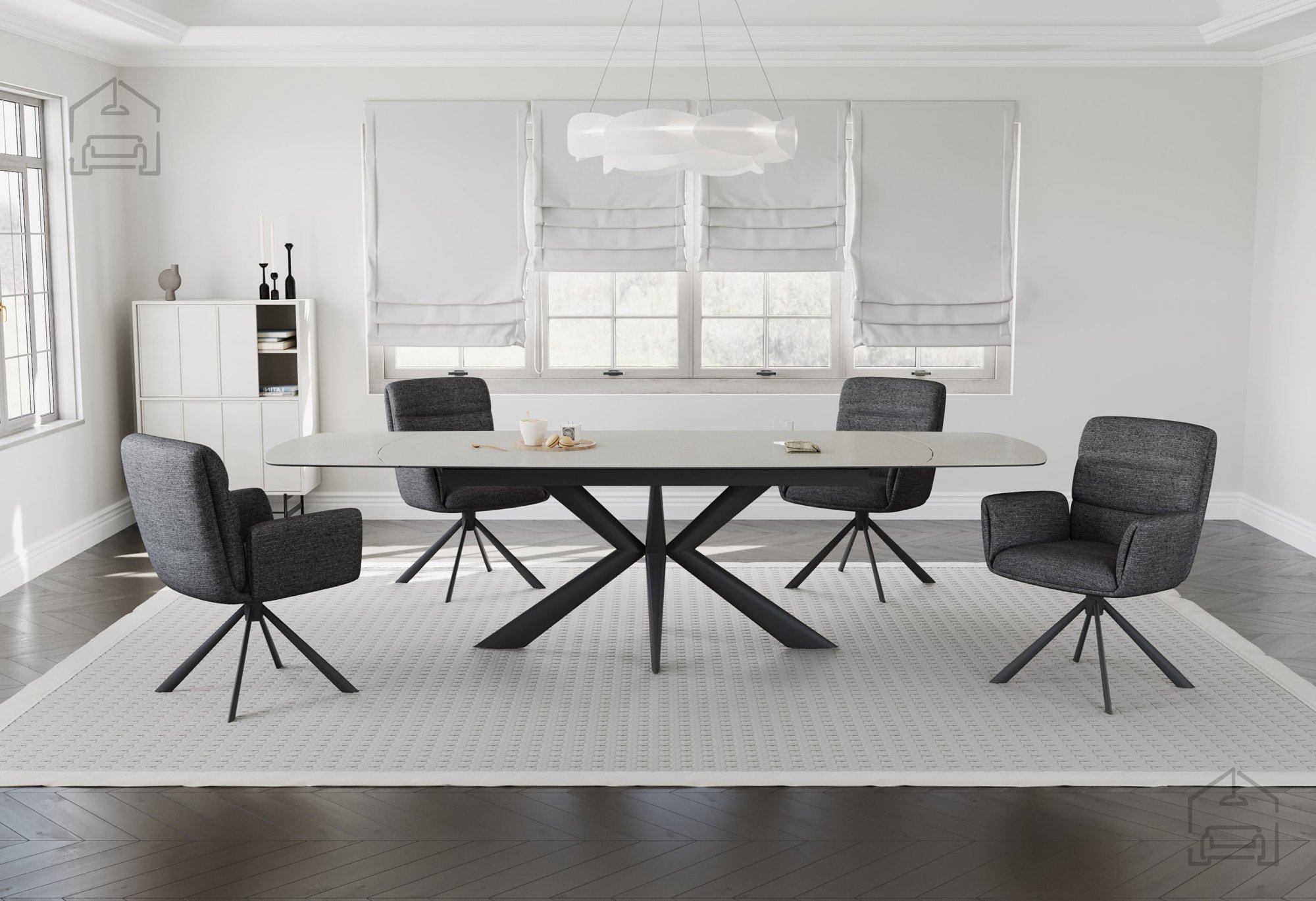 Der ästhetische Reiz des Oban-Tisches liegt im Kontrast zwischen der hellen, glatten Tischplatte und dem kräftigen, graphitschwarzen Untergestell. Diese Kombination schafft ein harmonisches Gleichgewicht zwischen Leichtigkeit und Stabilität. Die architektonisch gestalteten Beine wirken dynamisch, ohne aufdringlich zu sein, und machen den Tisch sowohl für offene Wohnkonzepte als auch für kleinere Essräume passend.