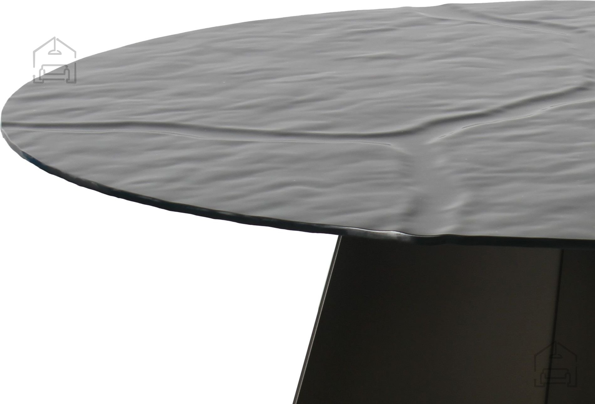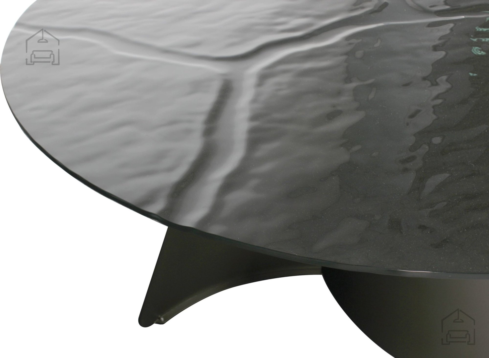 Die Tischplatte aus 12 mm starkem Schmelzglas besitzt eine leicht unregelmäßige Struktur, die an natürlich geformtes Glas erinnert. Diese Oberfläche verleiht dem Tisch Charakter und optische Tiefe. Der dunkel getönte Farbton Atrovirens reflektiert das Licht sanft und sorgt für einen edlen Look, der je nach Blickwinkel und Lichtsituation unterschiedlich wirkt.