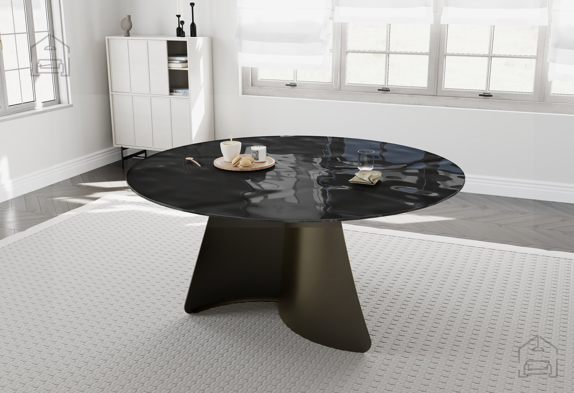 Das Tischgestell besteht aus drei gebogenen Metallplatten mit einer bronzefarbenen Oberfläche. Diese Konstruktion ist nicht nur optisch ansprechend, sondern auch äußerst stabil. Die weit auseinanderstehenden Beine bieten sicheren Halt für die Glasplatte und verleihen dem Tisch eine dynamische Silhouette, die die glänzende Glasfläche stilvoll ergänzt. Die Metallteile sind kratzfest behandelt und leicht zu reinigen, was den gepflegten Look dauerhaft erhält.